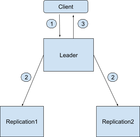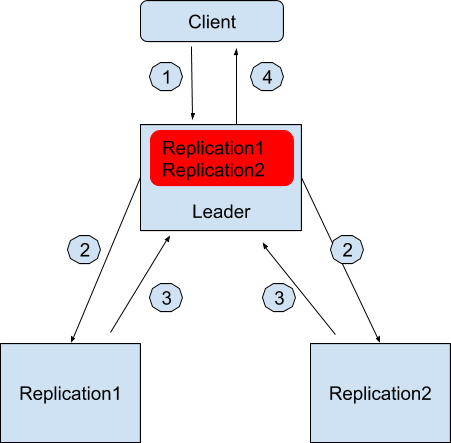 - 领导者节点收到请求后先在本地保存好,然后也同时发消息通知Replication1和Replication2。