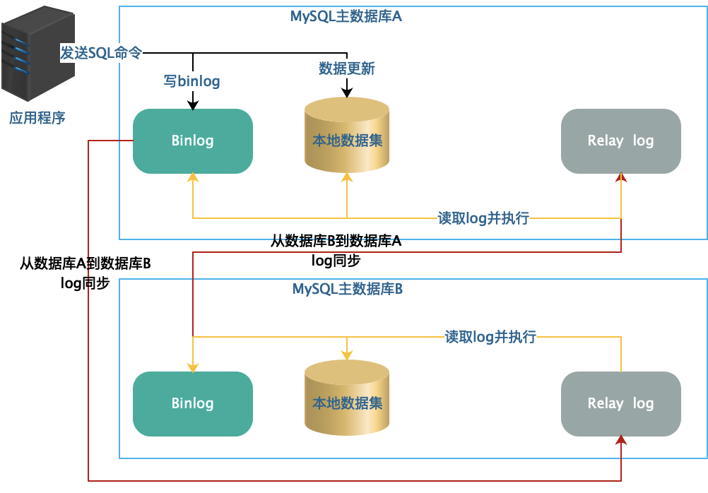 采用一主多从的方案,当某个从数据库宕机的时候,还可以将读操作迁移到其他从数据库上,保证读操作的高可用。但如果主数据库宕机,系统就没法使用了,因此现实中,也会采用MySQL主主复制的方案。也就是说,两台服务器互相备份,任何一台服务器都会将自己的Binlog复制到另一台机器的Relay Log中,以保持两台服务器的数据一致。