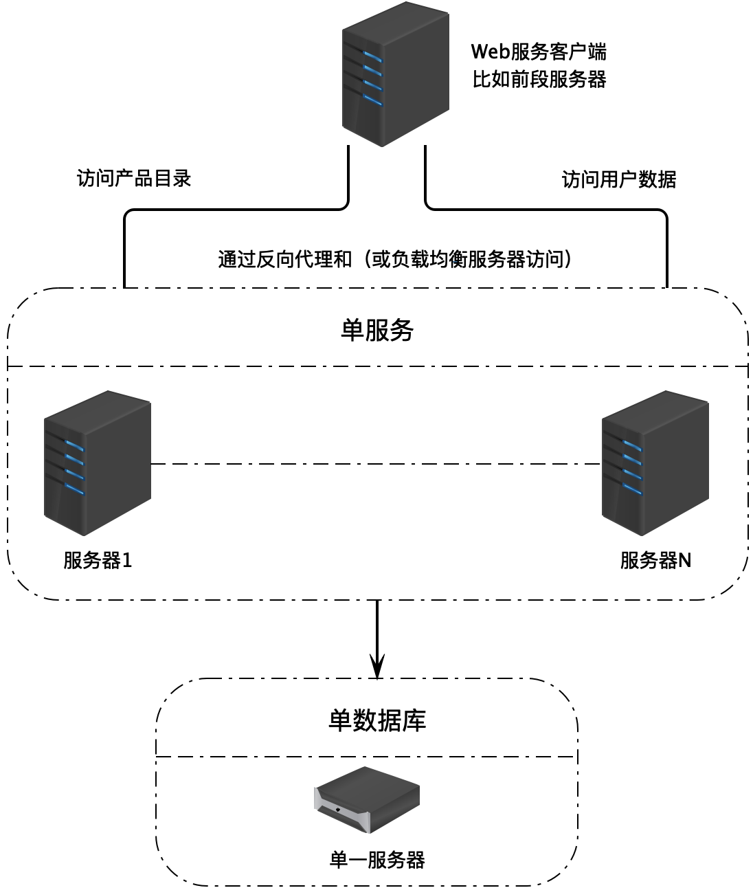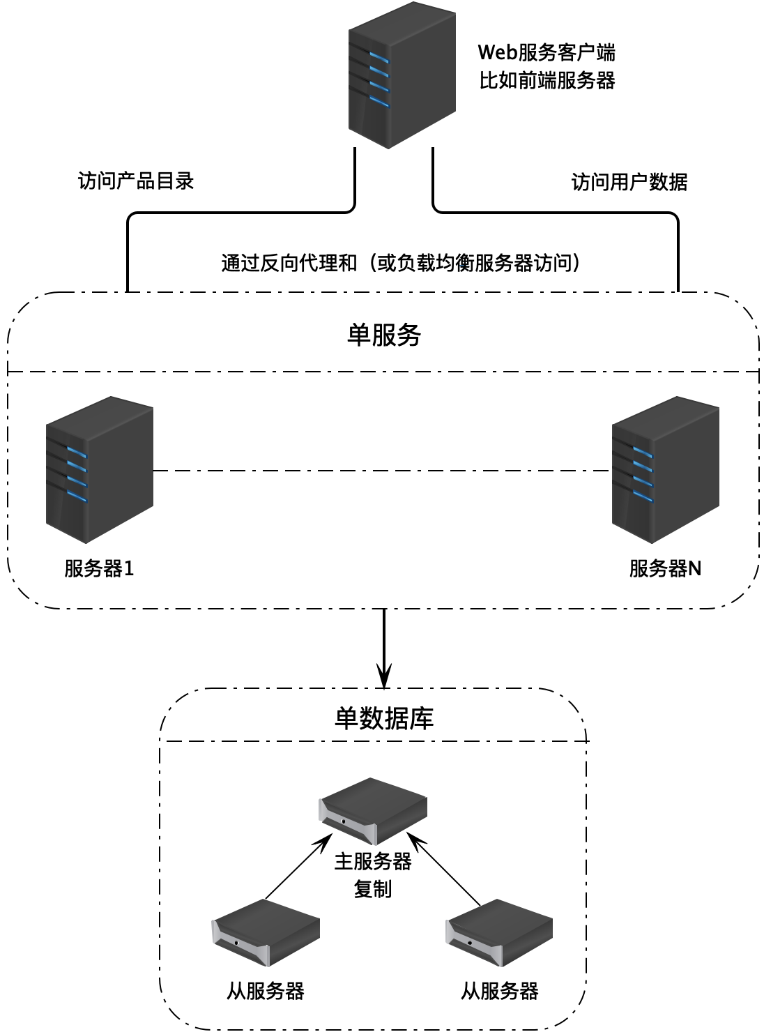 对于数据访问和存储压力不太大,对可用性要求也不太高的系统,也许部署在单一服务器上的数据库就可以解决,所有的应用服务器都连接访问这一台数据库服务器。