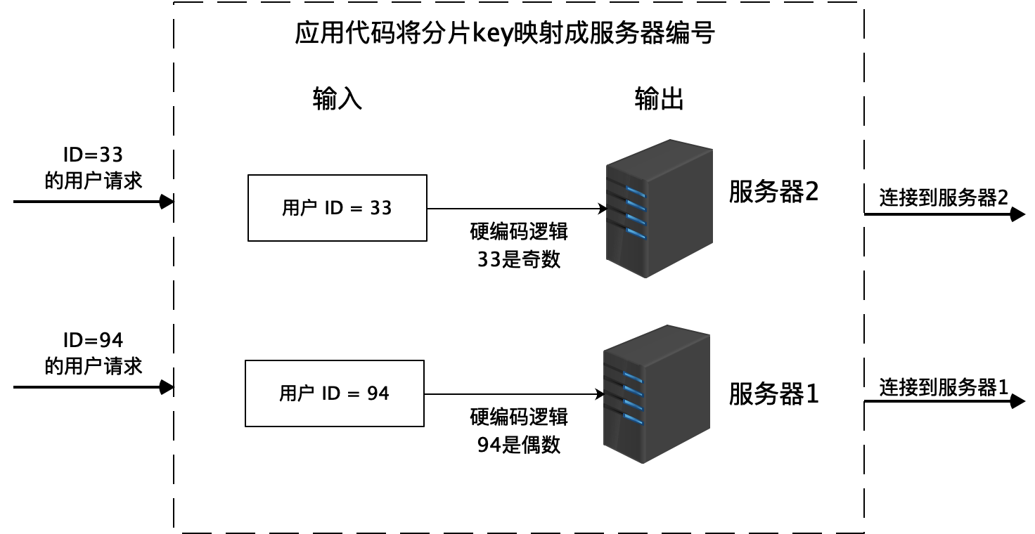 最简单的数据库分片存储可以采用硬编码的方式,在程序代码中直接指定一条数据库记录要存放到哪个服务器上。比如将用户表分成两片,存储在两台服务器上,那么就可以在程序代码中根据用户ID进行分片计算,ID为偶数的用户记录存储到服务器1,ID为奇数的用户记录存储到服务器2。