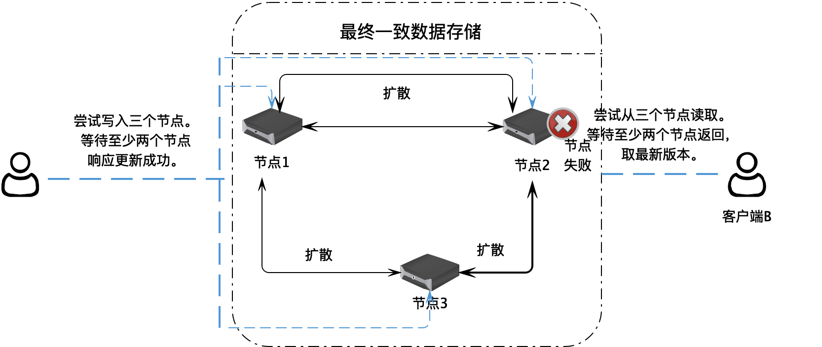 Apache Cassandra解决数据一致性的方案是,在用户写入数据的时候,将一个数据写入集群中的三个服务器节点,等待至少两个节点响应写入成功。用户读取数据的时候,从三个节点尝试读取数据,至少等到两个节点返回数据,并根据返回数据的时间戳,选取最新版本的数据。这样,即使服务器中的数据不一致,但是最终用户还是能得到一个一致的数据,这种方案也被称为最终一致性。