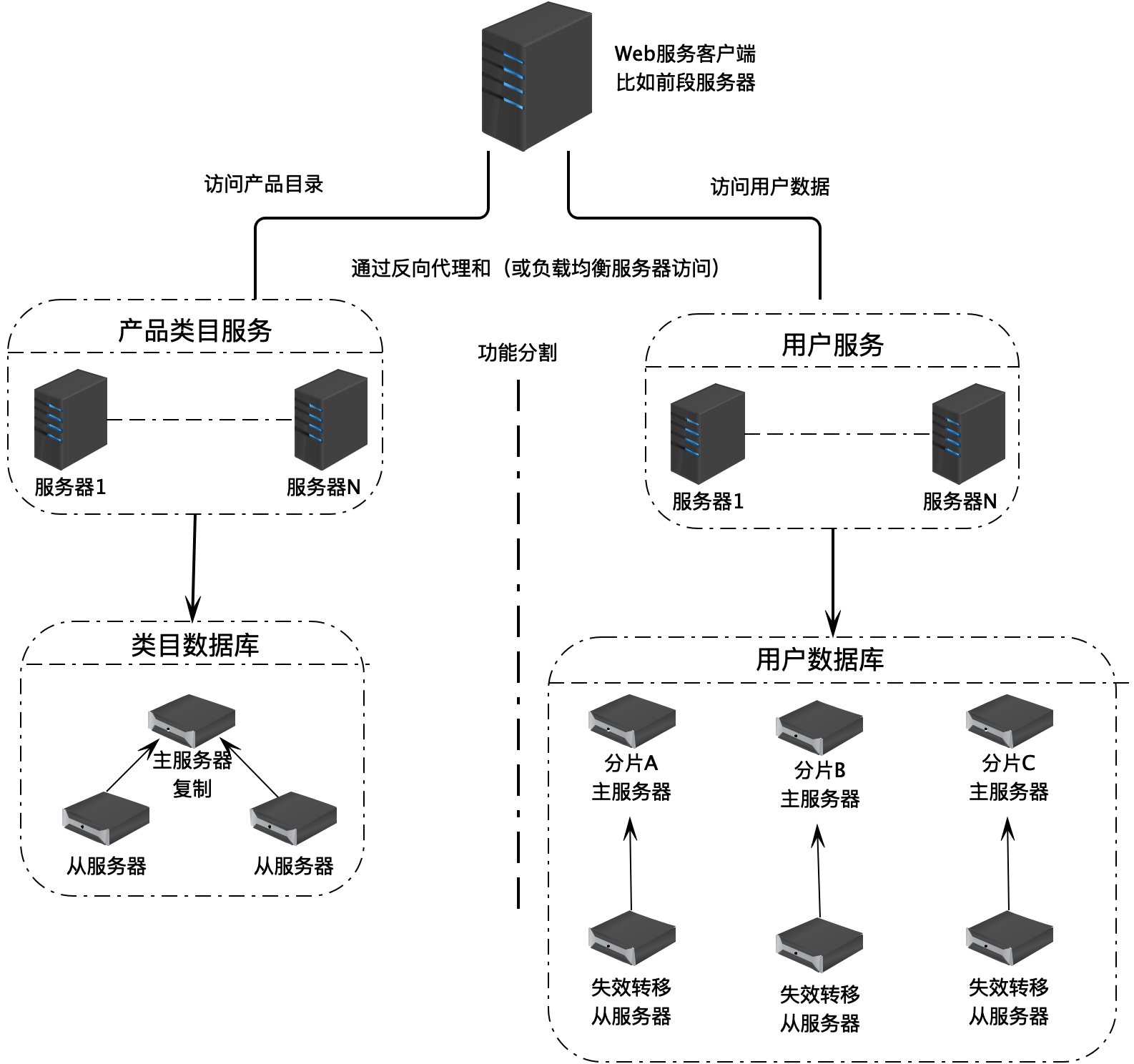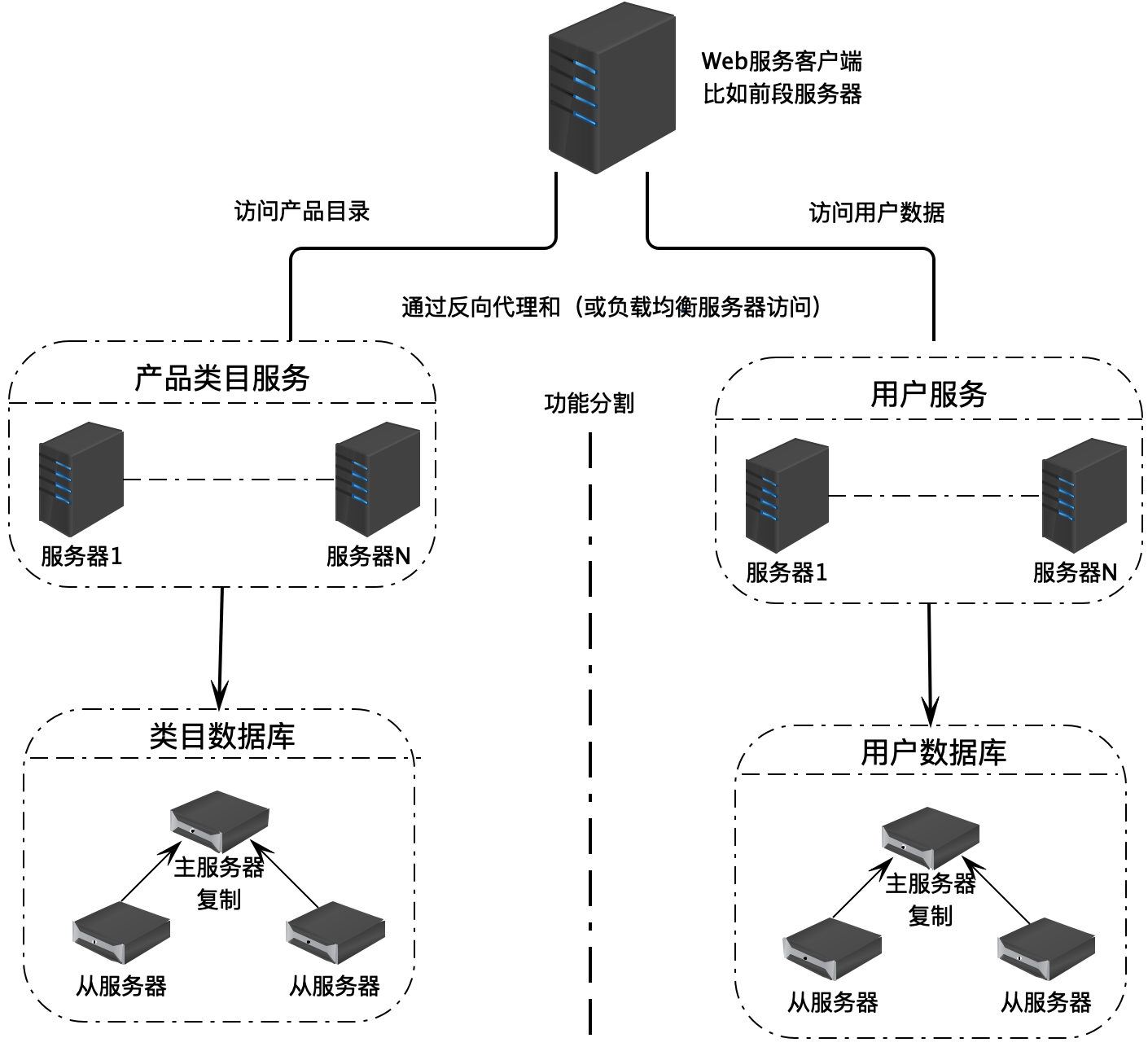 随着业务复杂以及数据存储和访问压力的增加,这时候可以选择业务分库。也就是说,将不同业务相关的数据库表,部署在不同的服务器上,比如类目数据和用户数据相对关联关系不大,服务的应用也不一样,那么就可以将这两类数据库部署在不同的服务器上。而每一类数据库还可以继续选择使用主从复制,或者主主复制。