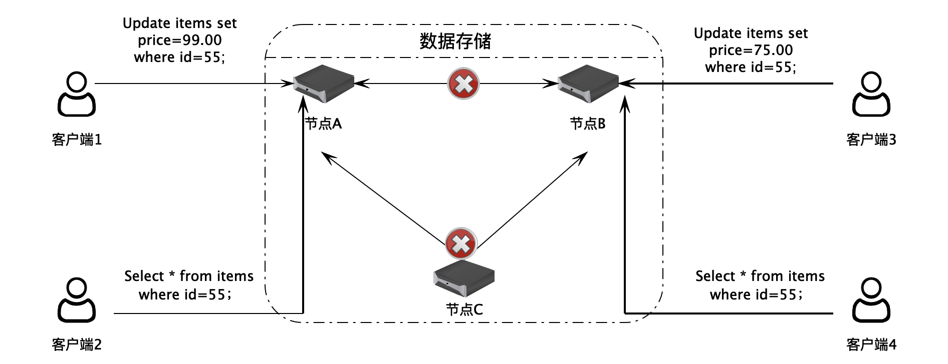 比如用户1连接服务器节点A,用户2连接服务器节点B,当两个用户同时修改某个数据的时候,如果正好服务器A和服务器B之间的网络通信失败,那么这两个节点上的数据也就不一致了,其他用户在访问这个数据的时候,可能会得到不一致的结果。