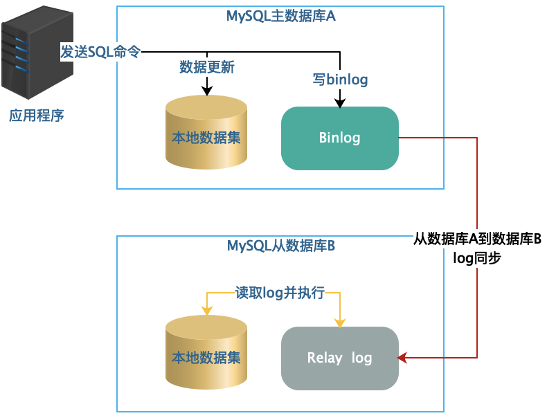 从服务器获得这条更新日志后,将其加入到自己的Relay Log中,然后由另外一个SQL执行线程从Relay log中读取这条新的日志,并把它在本地的数据库中重新执行一遍,这样当客户端应用程序执行一个update命令的时候,这个命令会同时在主数据库和从数据库上执行,从而实现了主数据库向从数据库的复制,让从数据库和主数据库保持一样的数据。