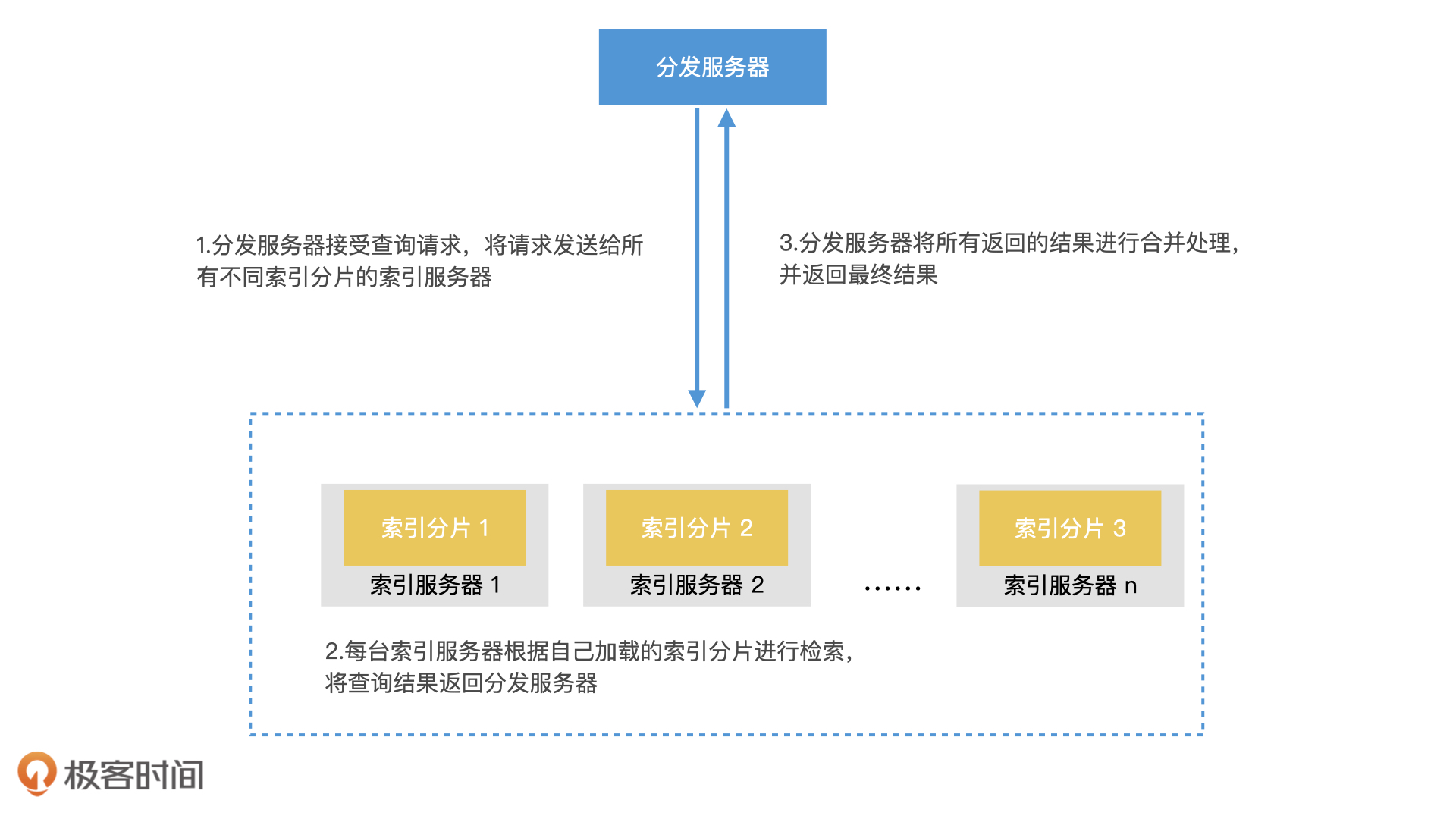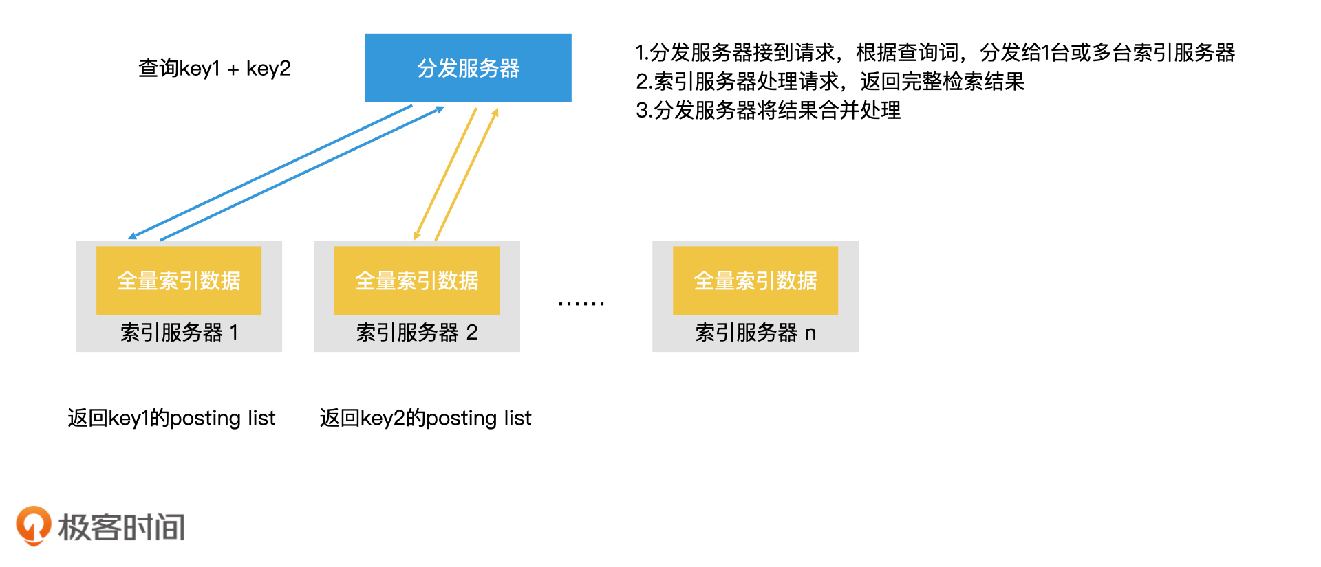 首先,我们需要一台接收请求的服务器,但是该服务器并不执行具体的查询工作,它只负责任务分发,我们把它叫作分发服务器。真正执行检索任务的是多台索引服务器,每台索引服务器上都保存着完整的倒排索引,它们都能完成检索的工作。