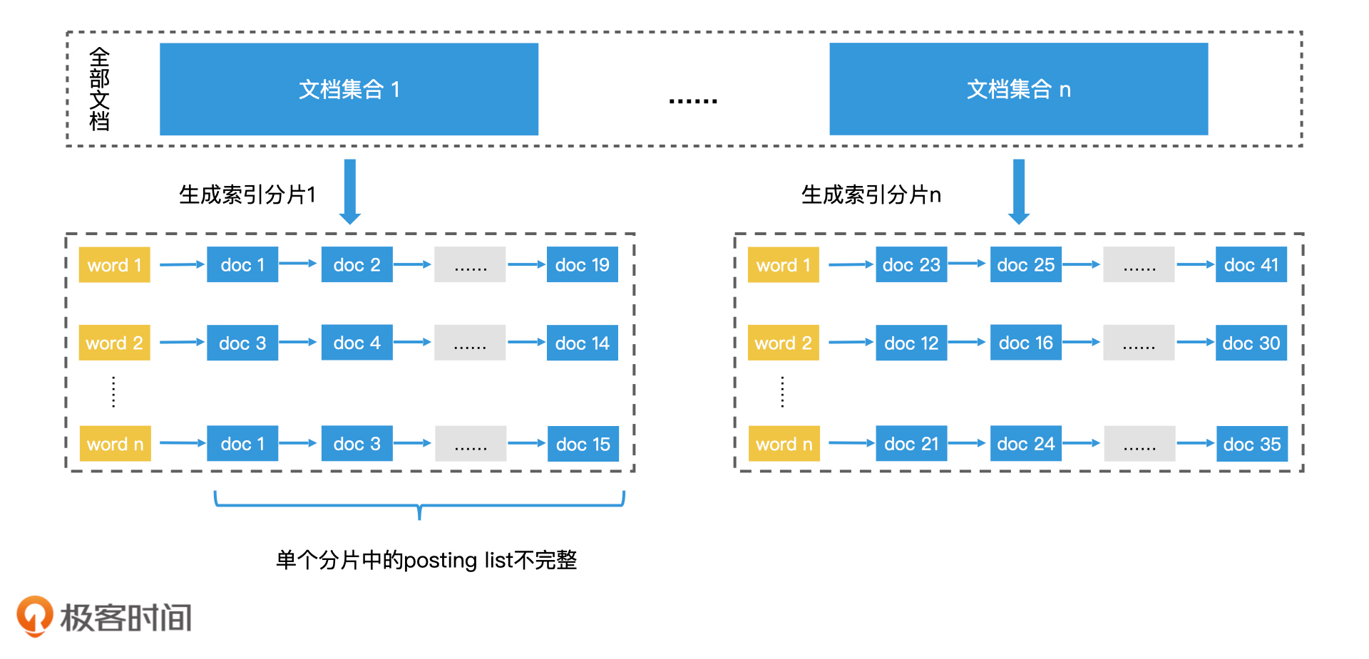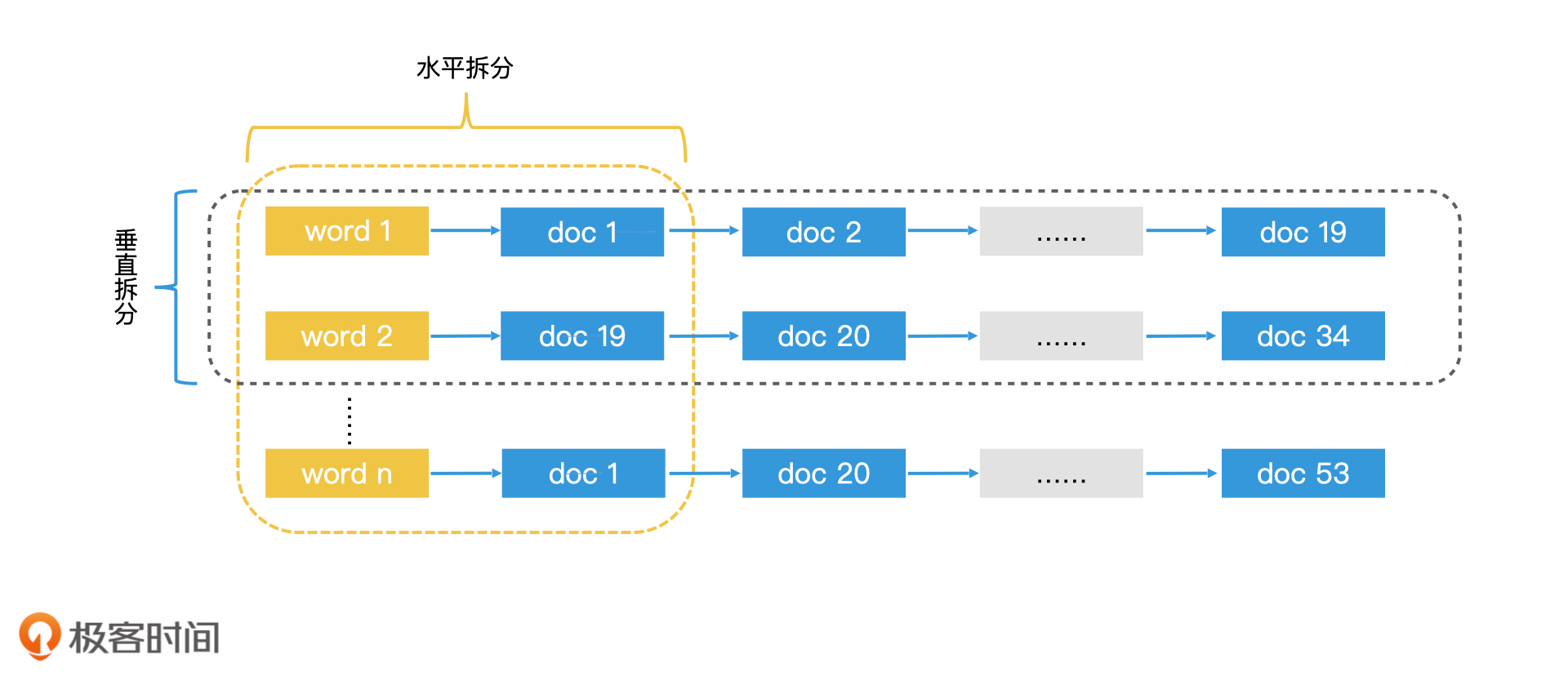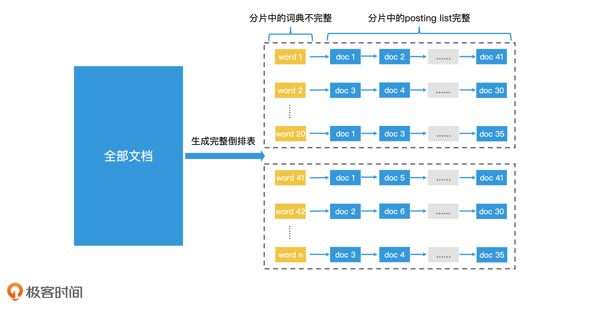 一般来说,根据处理对象将倒排索引进行拆分,每个索引分片都可能有完整的词典,但posting list不完整,这种拆分方案叫作水平拆分。如果是根据倒排索引中的关键词进行拆分,每个索引分片的词典都不完整,但是词典中的关键词对应的posting list是完整的,这种拆分方案叫作垂直拆分。