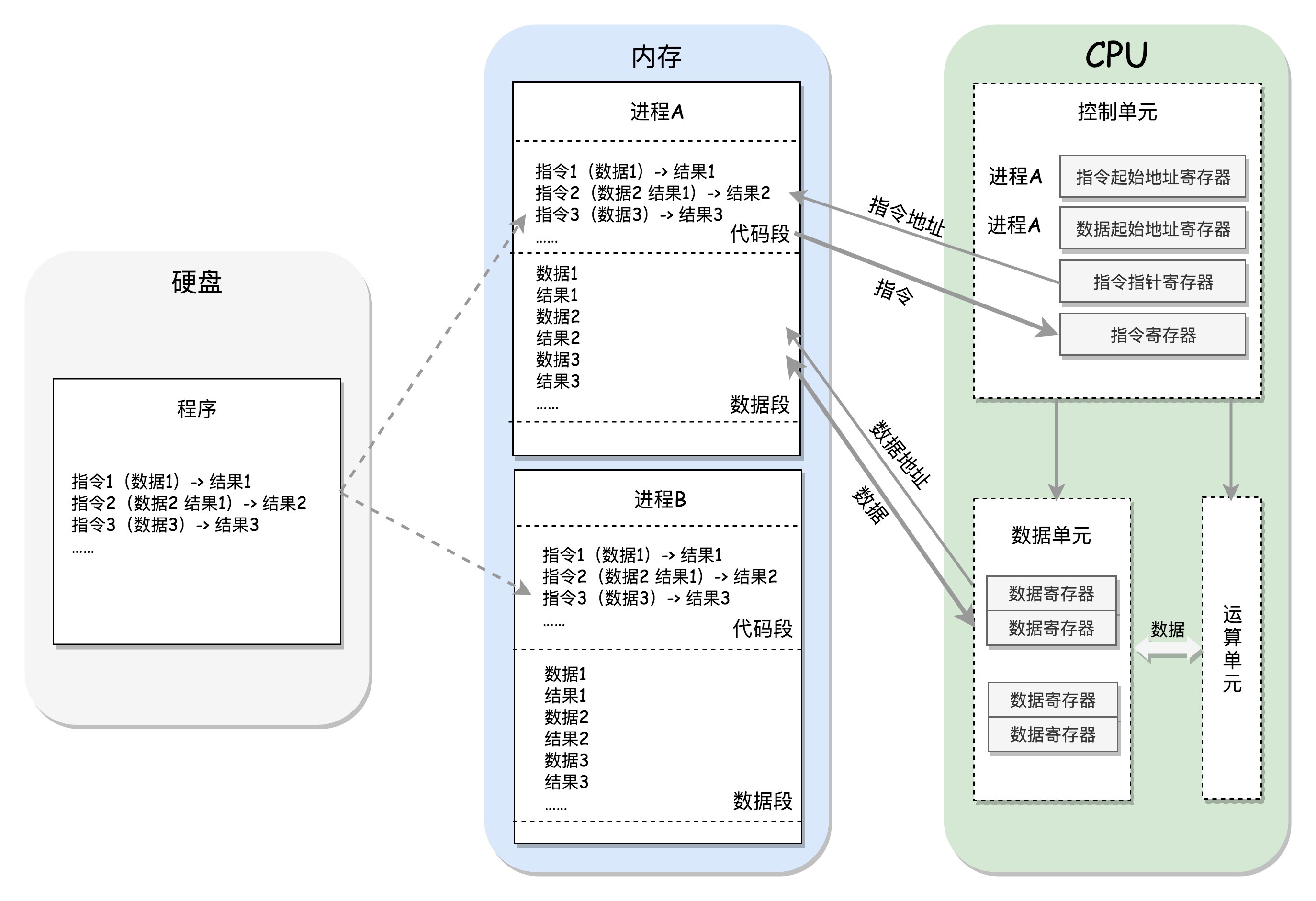 “指令一般是分两部分,一部分表示做什么操作,例如是加法还是位移;另一部分是操作哪些数据。数据的部分,CPU员工会从数据段里面读取出来,记在脑子里,然后进行处理,处理完毕的结果,再写回数据段。当项目执行计划书里面的所有指令都执行完毕之后,项目也就完成了,那就可以等着收钱啦。”