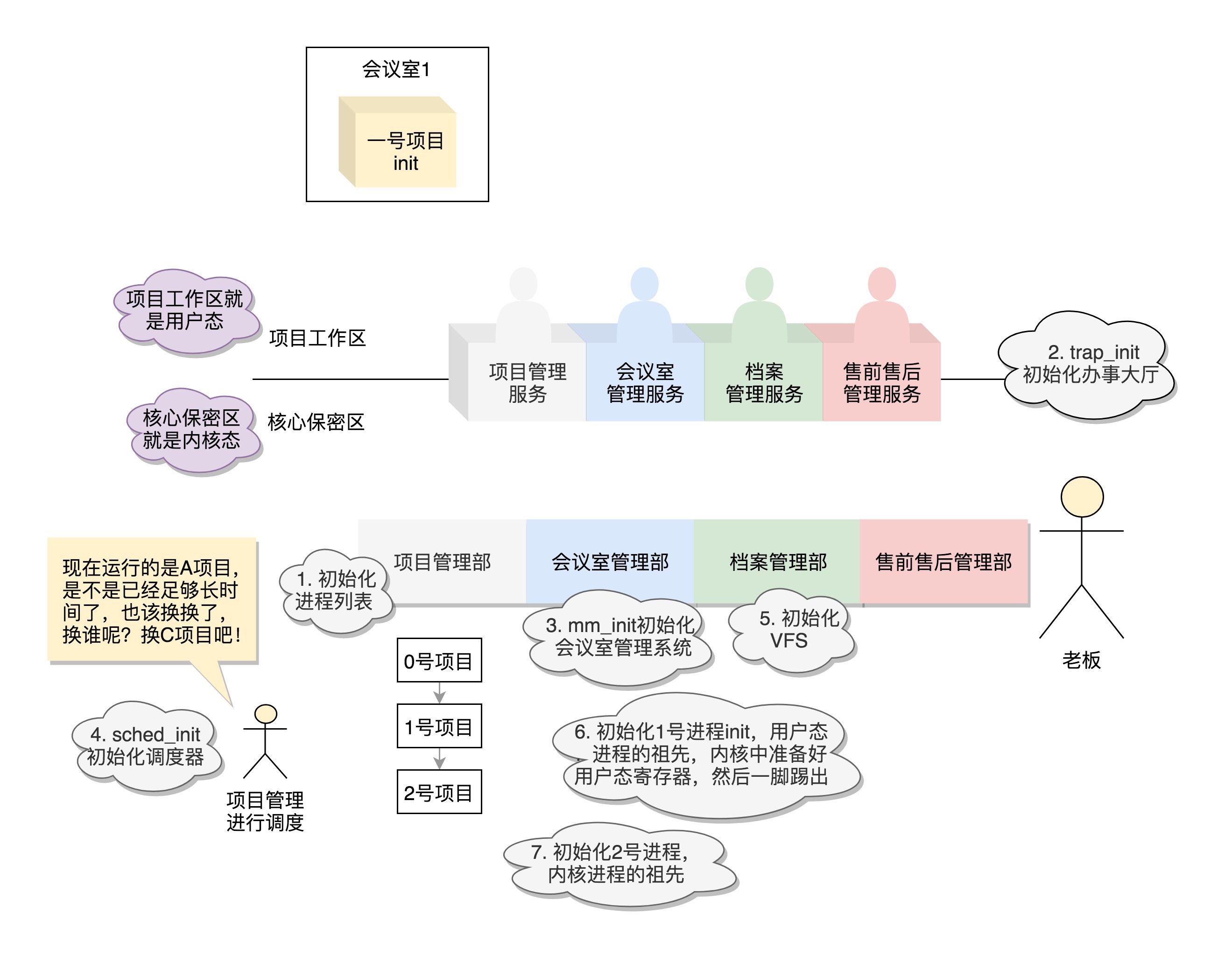 第二天,小马请周瑜和张昭吃饭,邀请他们加入他的创业公司。小马说,公司要正规运转起来,应该分清内外,外部项目需要有人帮忙管理好——也就是用户态,内部公司的核心资源也需要管理好——也就是内核态。现在我一个人忙不过来,需要两位兄弟的加入,周瑜主外,张昭主内,正所谓,内事不决问张昭,外事不决问周郎嘛。