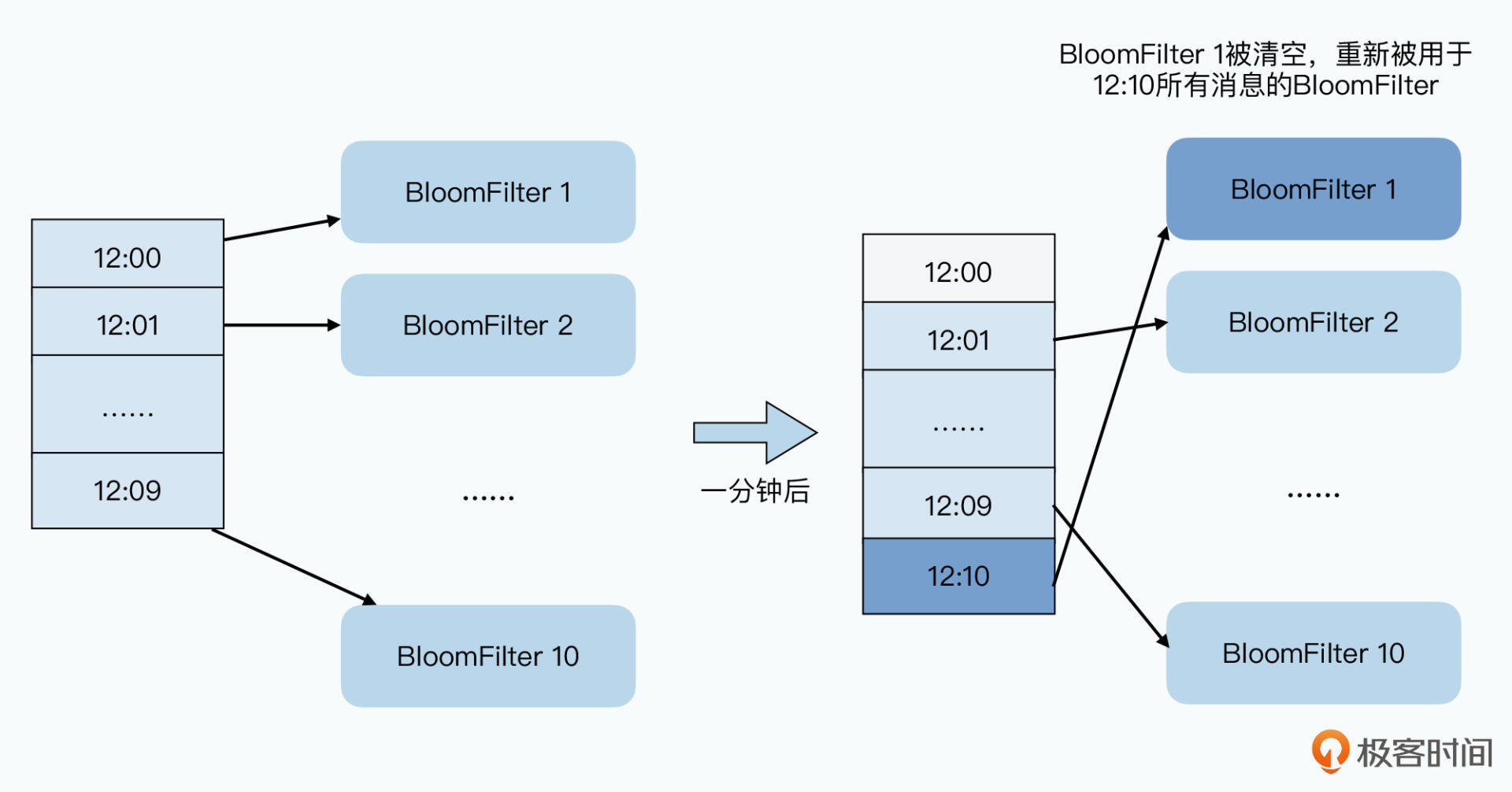 - 第二个,是把数据按照时间窗口,切分成多个BloomFilter。比如,我们可以设定有30个BloomFilter,每个BloomFilter都只存放某一分钟的message-id。而每过一分钟,我们都把30分钟前的那个BloomFilter清空。这样,我们可以通过一个固定大小的内存空间,确保只要是30分钟内的重复数据,就不会被多次处理。因为一般来说,简单的重发,不太可能超过30分钟。我们可以根据系统的实际情况,来设定这个对应的时间窗口。