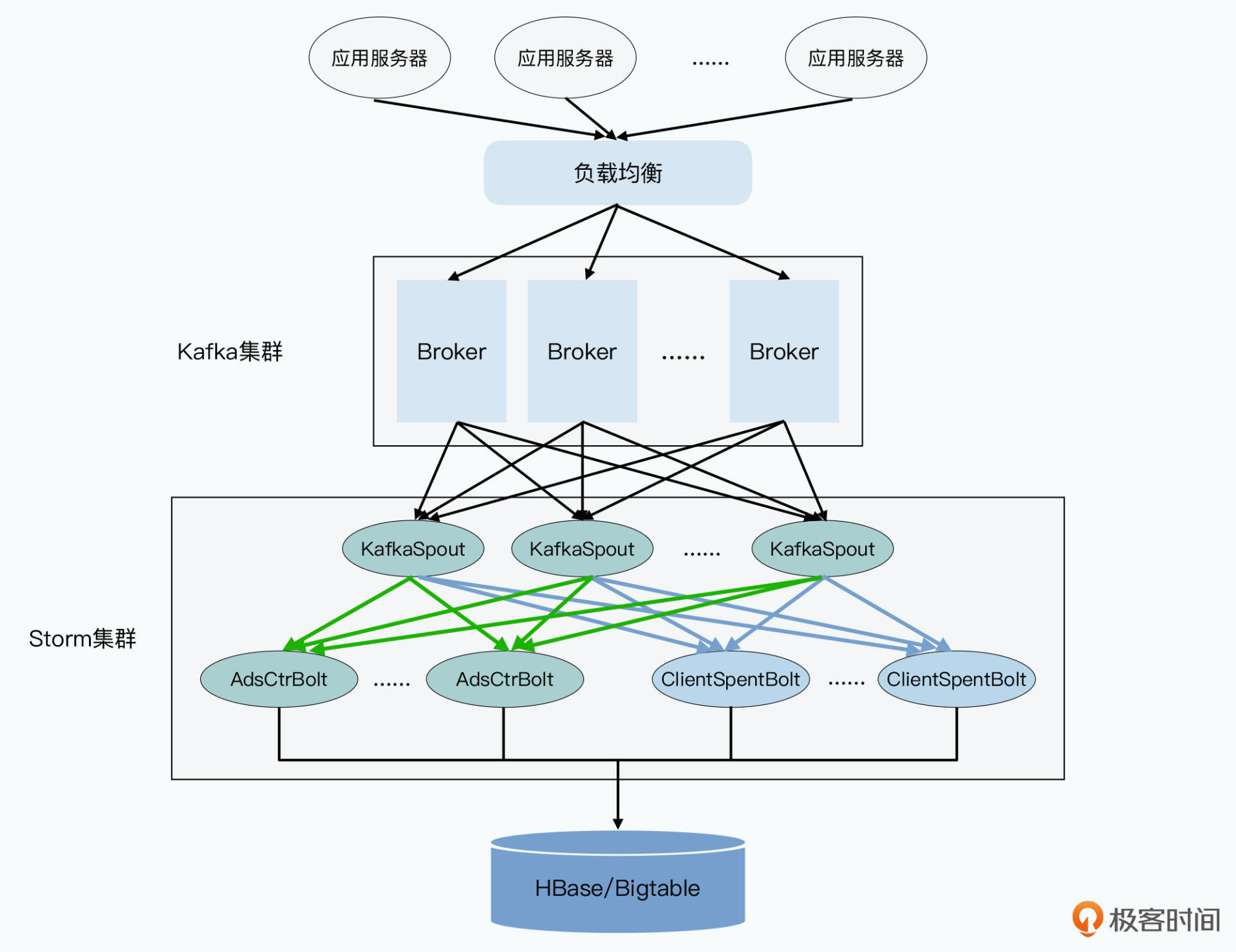广告ID=>(展示次数,点击次数,广告花费)的Map。然后定时把这个表输出到外部的数据库里,比如HBase或者Bigtable这样的数据库。也就是,它会每分钟输出一次对应广告ID的点击率信息。 - ClientSpentBolt的逻辑也很简单,就是它可以以更高的频率,比如每秒,甚至每次接收到一次广告点击,就对应更新一次HBase里的广告花费数据。