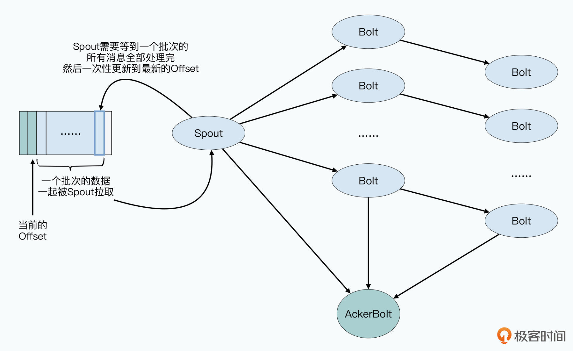 因为为了性能考虑,我们从Kafka拉取数据,不会是拉一条、处理一条,然后更新一次ZooKeeper上的偏移量。特别是ZooKeeper会受不了这么大的负载,它和Chubby一样,是用于实现一个粗粒度的分布式锁,而不是一个高性能的KV存储。所以,KafkaSpout会从Kafka拉一小批数据,然后发送出去,等到这一小批数据发送完了,并且下游都处理完了,才会变更一次ZooKeeper上的偏移量。