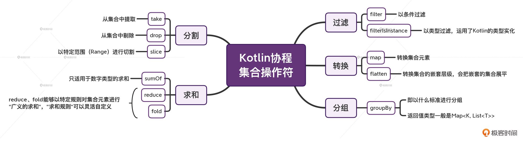 过滤,filter、filterIsInstance,前者是以条件过滤 ,后者是以类型过滤 ,后者运用了Kotlin的类型实化 。 转换,map、flatten,前者是转换集合元素 ,后者是转换集合的嵌套层级 ,flatten会把嵌套的集合展平 。 分组,groupBy,即以什么标准进行分组 ,它的返回值类型往往会是 Map<K, List<T>>。 分割,take、drop、slice。take代表从集合中提取 ,drop代表从集合中剔除 ,slice代表以特定范围 (Range)进行切割。 求和,sumOf、reduce、fold。sumOf只适用于数字类型的求和,reduce、fold则能够以特定规则对集合元素进行“广义的求和”,其中的“求和规则”我们可以灵活自定义,比如字符串拼接。