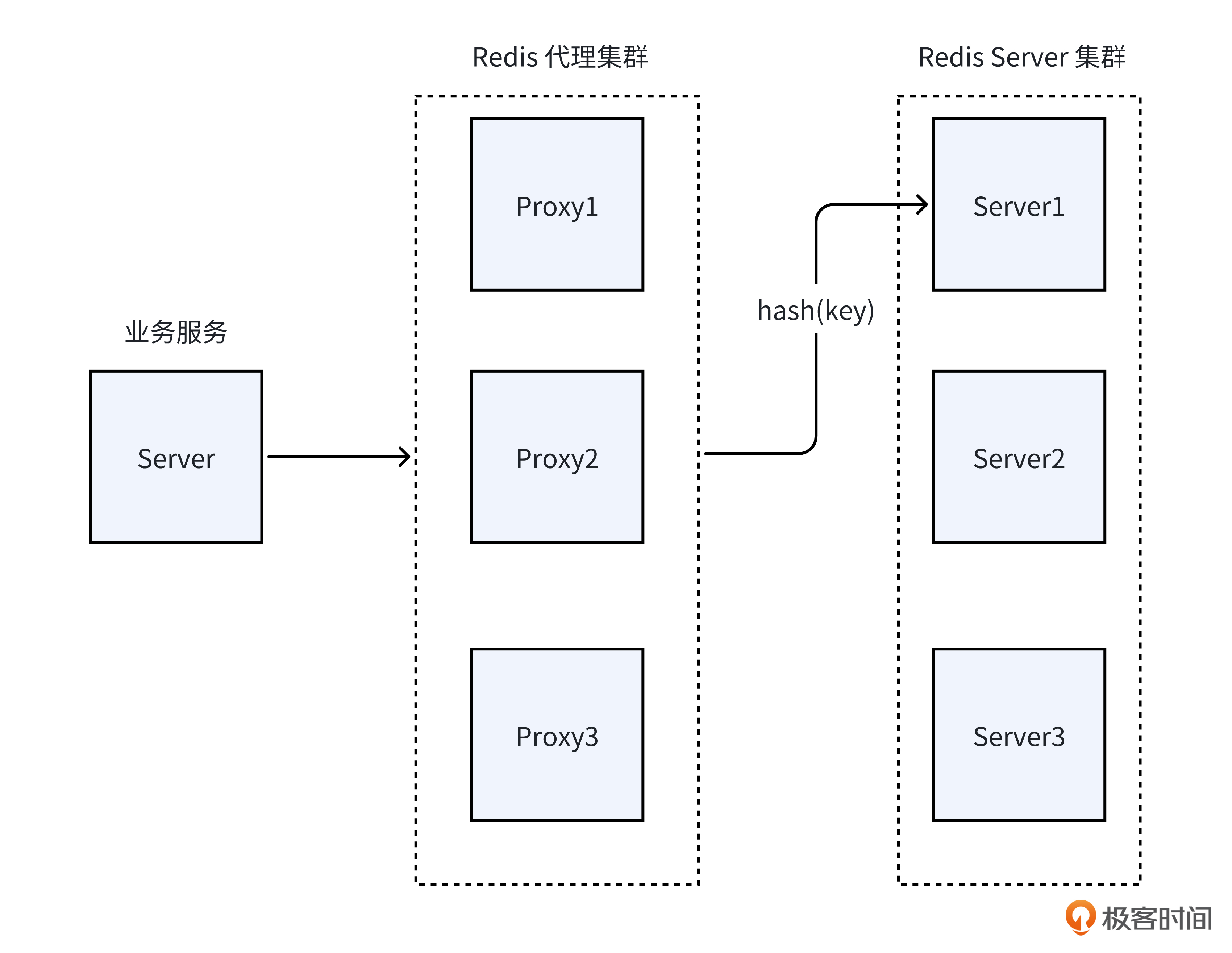 就像下面的图展示的一样,当从 Redis 读取数据时,Redis 代理服务会基于 Key 进行 Hash 计算,以此定位到 Redis 中实际存放数据的后端 Redis Server。所以,要是某个 Key 的访问 QPS 突然大幅攀升,那么这个 Key 所在的 Redis Server 就会有部分请求被迫排队,进而导致延迟升高,严重时还会出现超时失败的状况。这便是我们平常所说的热 Key 问题,而那些被高频率访问的 Key 就是热 Key。