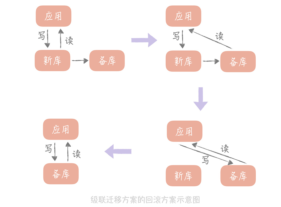 **这种方案的回滚方案也比较简单,**可以先将读流量切换到备库再暂停应用的写入,将写流量切换到备库,这样所有的流量都切换到了备库,也就是又回到了自建机房的环境,就可以认为已经回滚了。