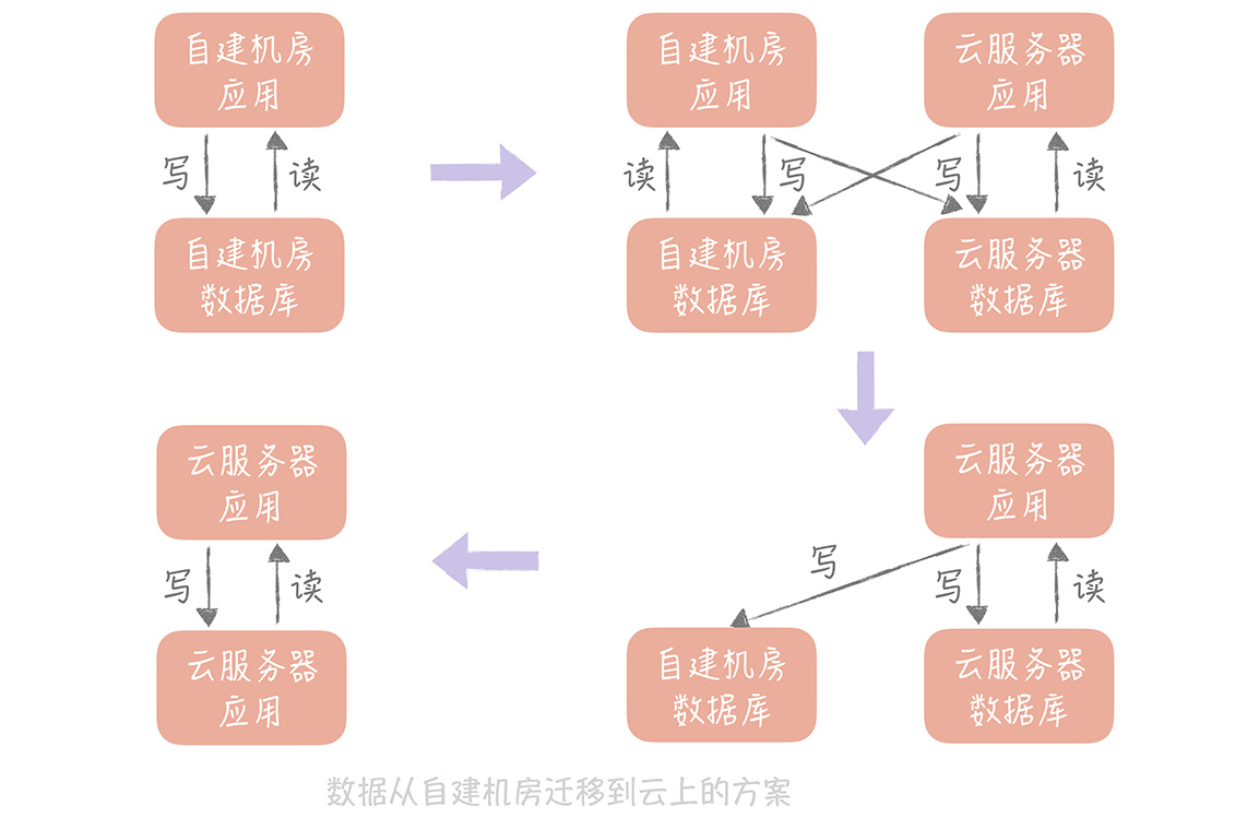 其实在实际工作中,不只是对数据库拆分时会做数据迁移,**很多场景都需要你给出数据迁移的方案,**比如说某一天,你的老板想要将应用从自建机房迁移到云上,那么你就要考虑将所有自建机房中的数据,包括MySQL、Redis、消息队列等组件中的数据全部迁移到云上,这无论对哪种规模的公司来说都是一项浩瀚的工程,所以你需要在迁移之前准备完善的迁移方案。