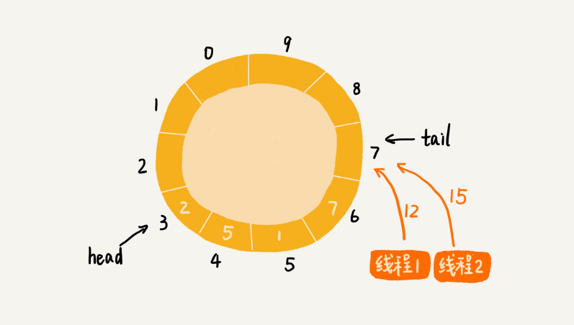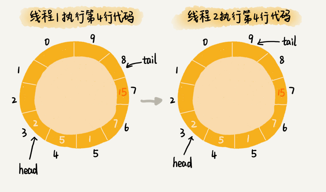 两个线程同时往队列中添加数据,也就相当于两个线程同时执行类Queue中的add()函数。我们假设队列的大小size是10,当前的tail指向下标7,head指向下标3,也就是说,队列中还有空闲空间。这个时候,线程1调用add()函数,往队列中添加一个值为12的数据;线程2调用add()函数,往队列中添加一个值为15的数据。在极端情况下,本来是往队列中添加了两个数据(12和15),最终可能只有一个数据添加成功,另一个数据会被覆盖。这是为什么呢?