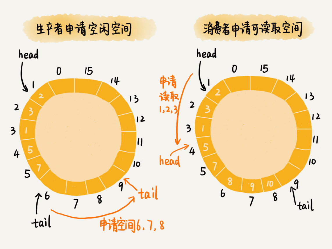 对于生产者来说,它往队列中添加数据之前,先申请可用空闲存储单元,并且是批量地申请连续的n个(n≥1)存储单元。当申请到这组连续的存储单元之后,后续往队列中添加元素,就可以不用加锁了,因为这组存储单元是这个线程独享的。不过,从刚刚的描述中,我们可以看出,申请存储单元的过程是需要加锁的。