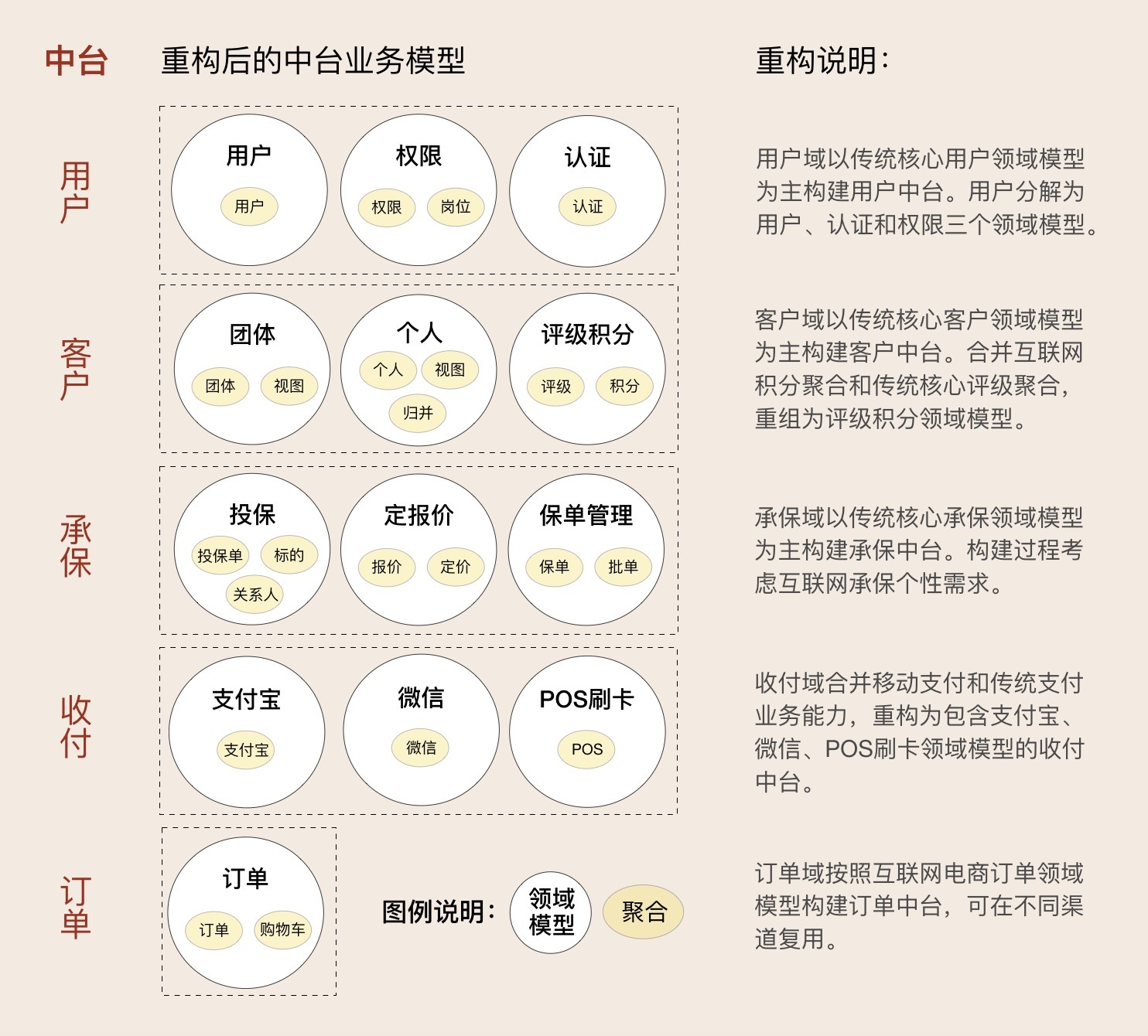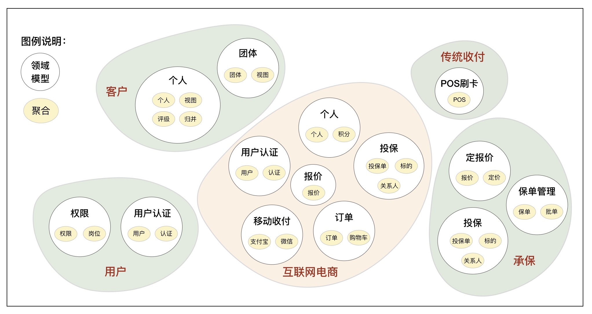 从上面这张图中,我们可以看到传统核心共构建了八个领域模型。其中用户域构建了用户认证和权限两个领域模型,客户域构建了个人和团体两个领域模型,传统收付构建了POS刷卡领域模型,承保域构建了定报价、投保和保单管理三个领域模型。