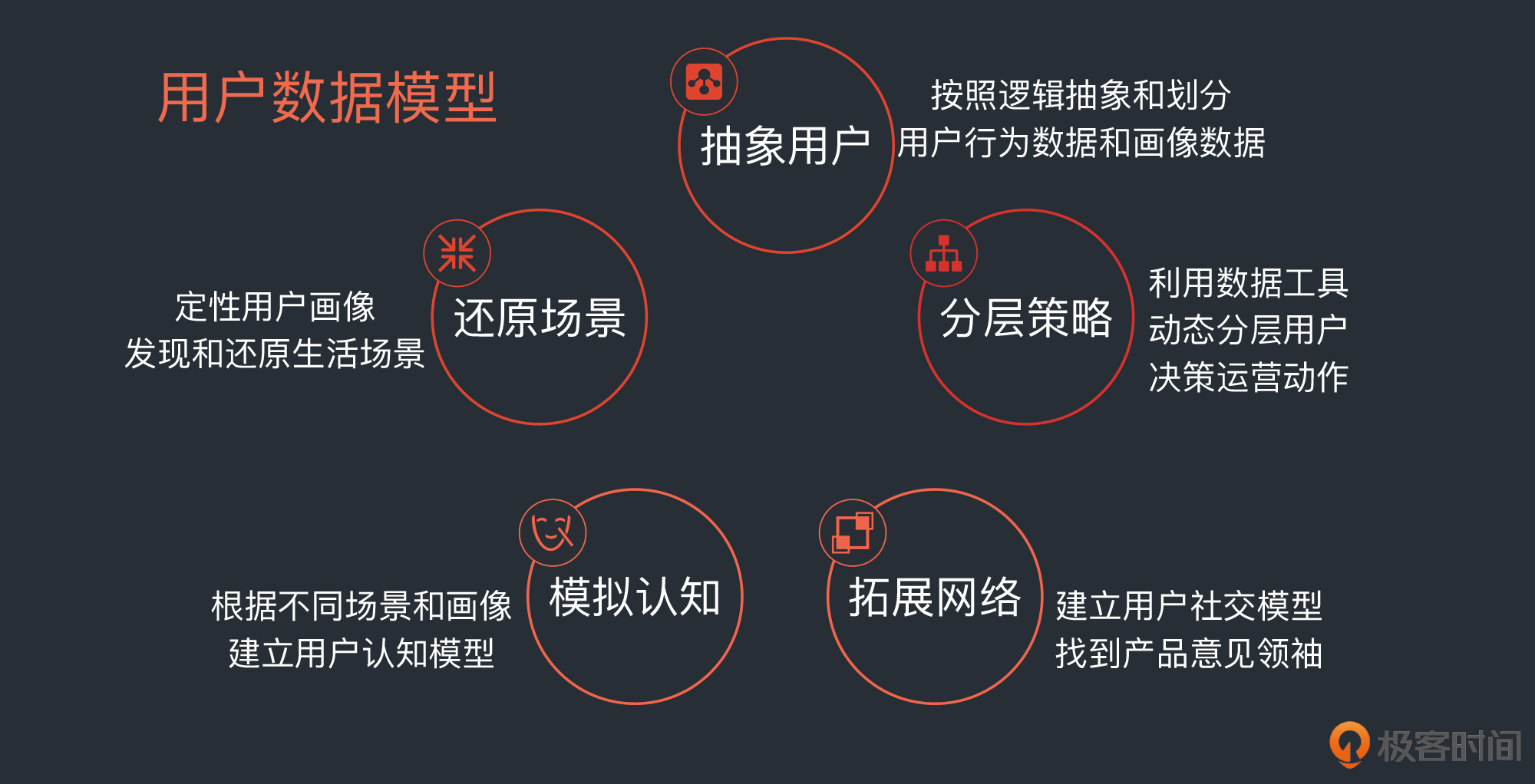 任何事情都是从无到有发展出来的,我们需要通过五步建立起数据模型,分别是抽象用户、还原场景、分层策略、模拟认知、拓展网络。接下来我们就依次来看一下。