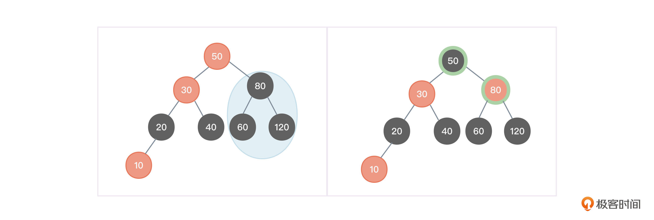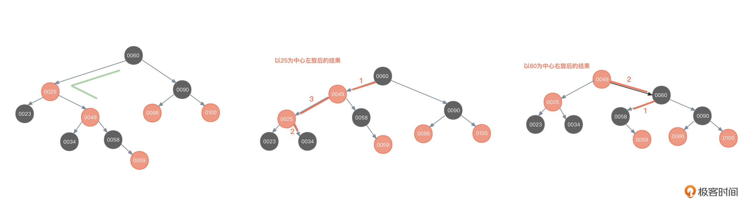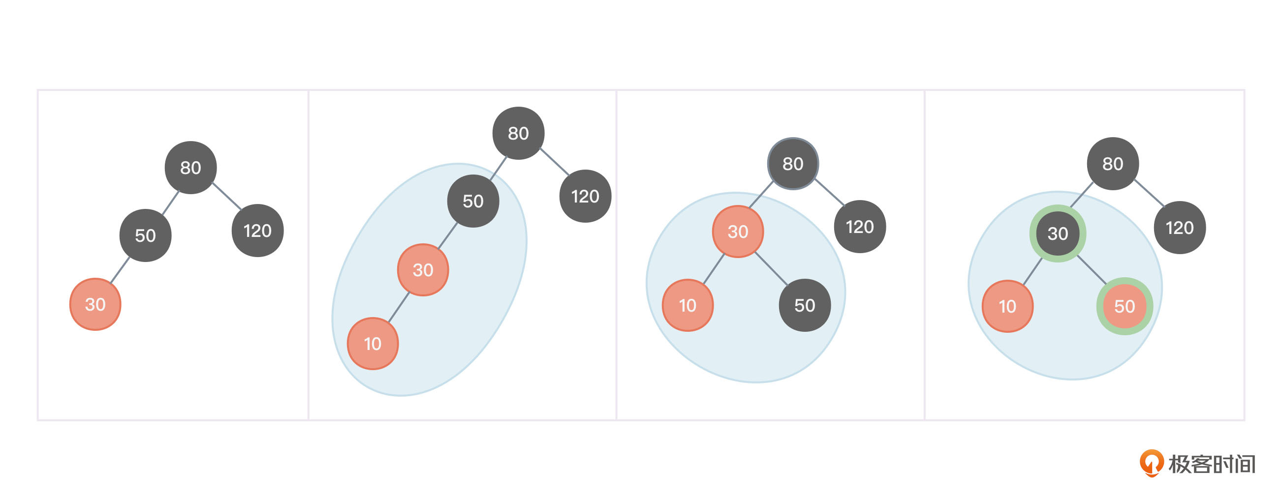 - 以节点50为根,向右旋转,将30作为50的父节点。向右旋转你应该不陌生,前面讲平衡二叉树时已经详细讲解过;