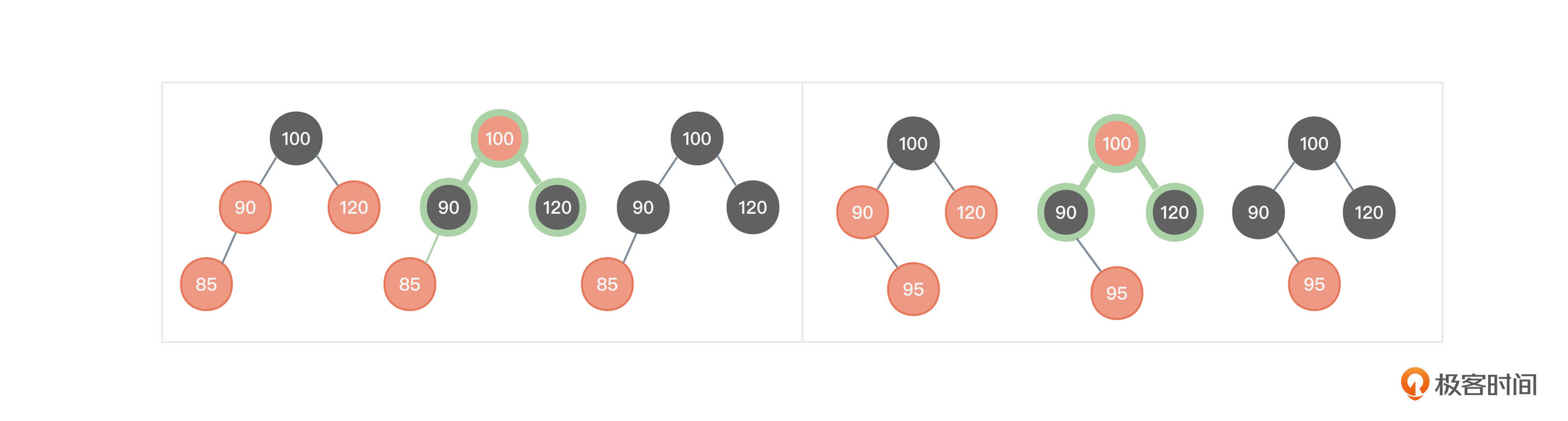 现在的情形是爷爷节点100是黑色,父亲节点90是红色,叔叔节点120是红色,插入新节点之前是个红黑树。在插入红色新节点85或者95之后,造成了父亲节点和新节点(孩子节点)这两个红色节点相邻,从而需要进行平衡性调整的情况。从而得出了一条平衡性调整规则。