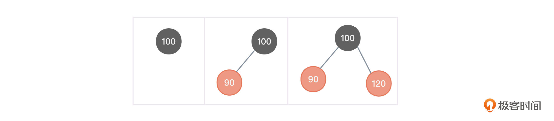 如果现在向红黑树中分别插入100、90、120三个值来作为三个节点创建红黑树,那么不需要进行任何平衡性调整,得到的红黑树如图2的步骤所示。