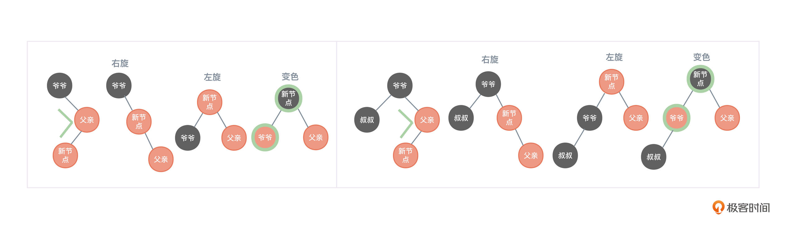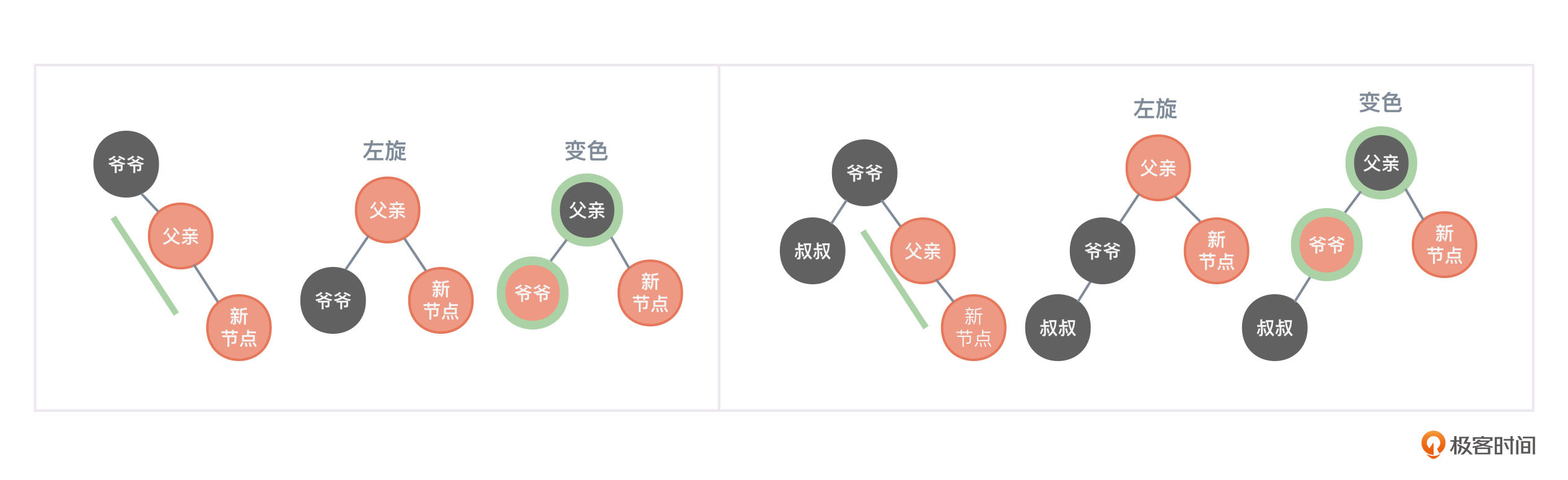 当然,图11可能只是某棵红黑树的一部分,所以可能对于“以父亲节点为根向左旋转,然后再以爷爷节点为根向右旋转”的理解会造成一定的困扰,你可以继续参考图12,会对旋转理解得更全面。