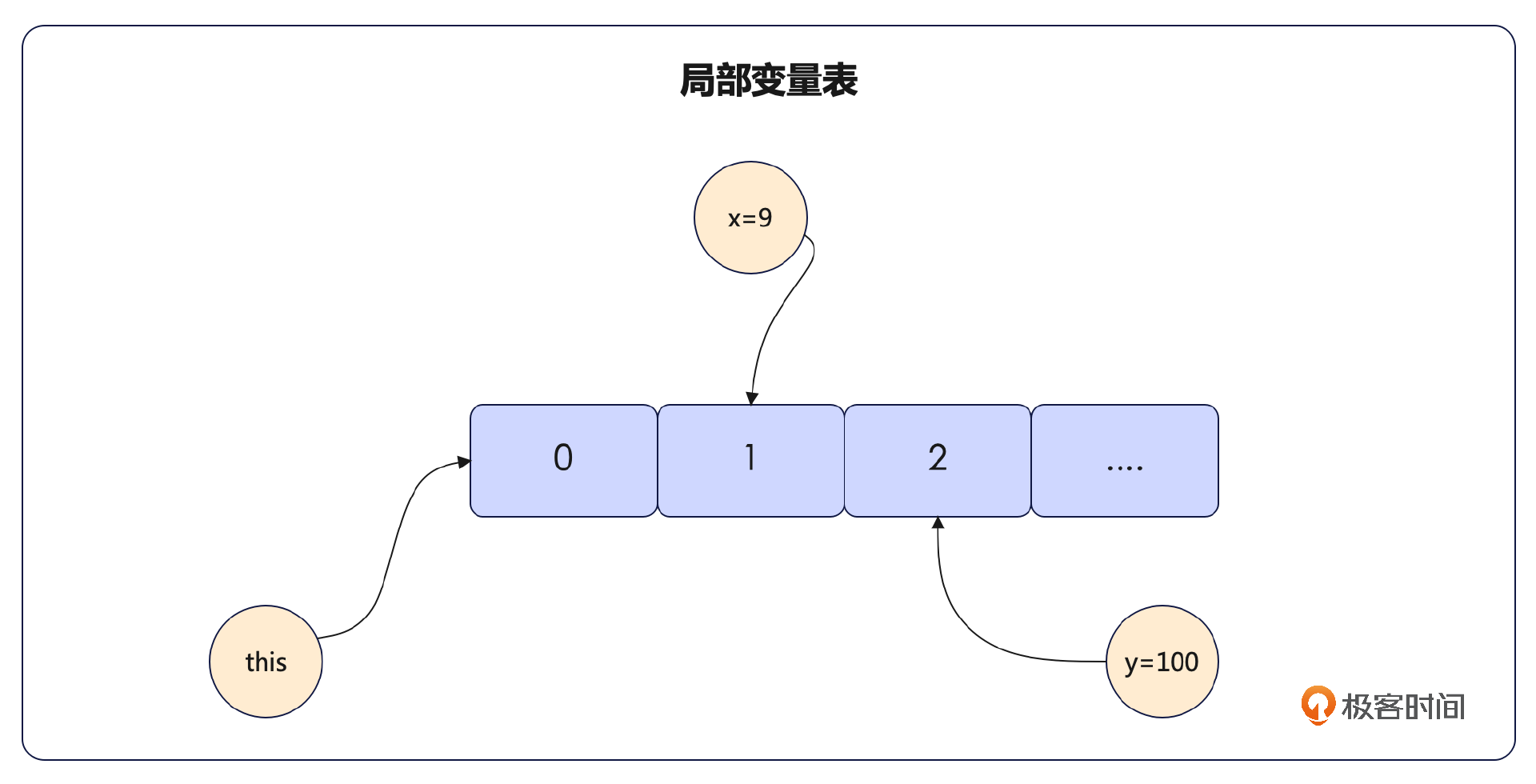 局部变量表是 GC Root 的一部分,当slot里存放的数据类型是reference的时候,它关联的对象就是GC里的 “可达对象”。关于JVM定位可达对象的详细信息,在课程的第13讲我会详细介绍。