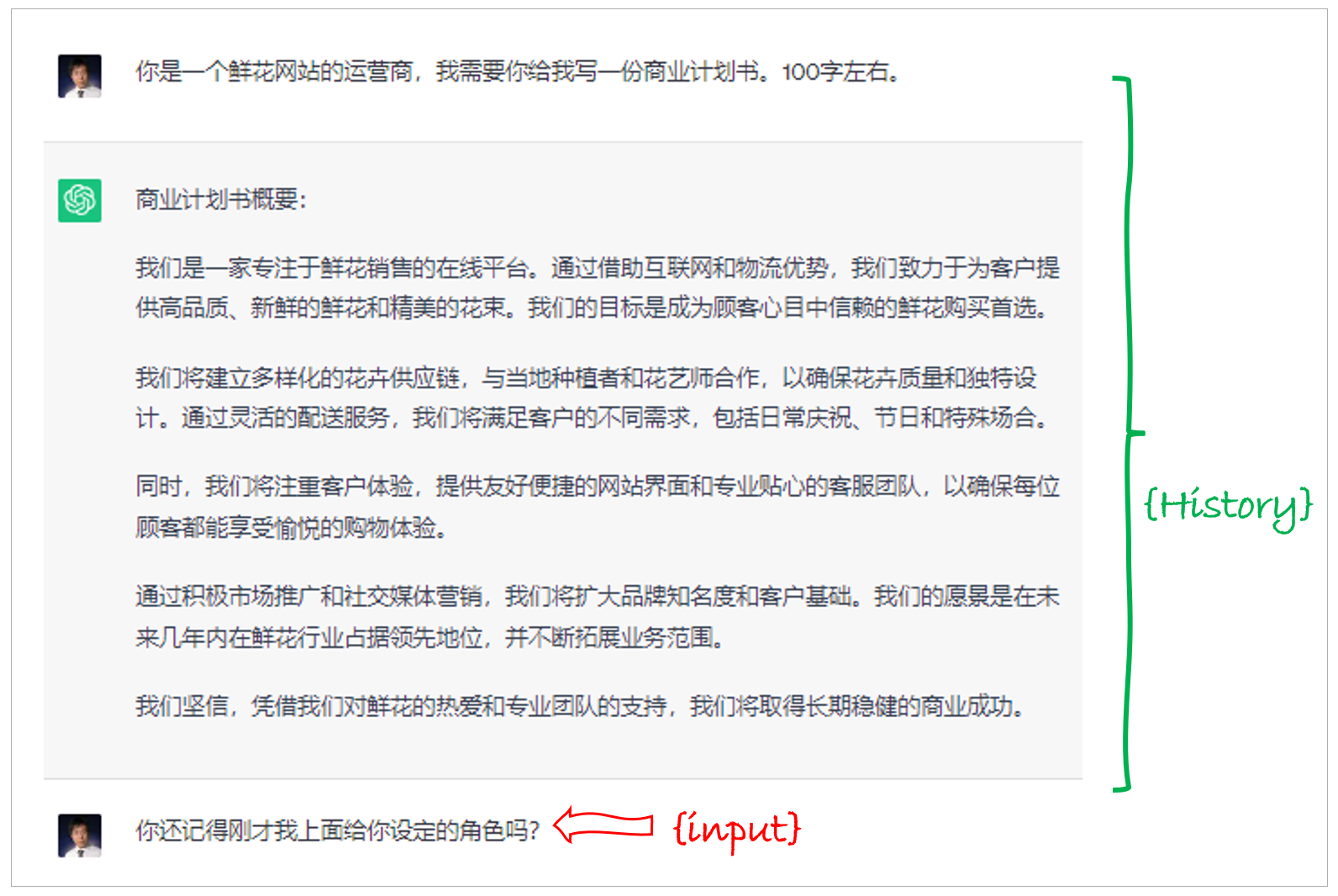 之后,我们看到两个参数 {history} 和 {input}。
