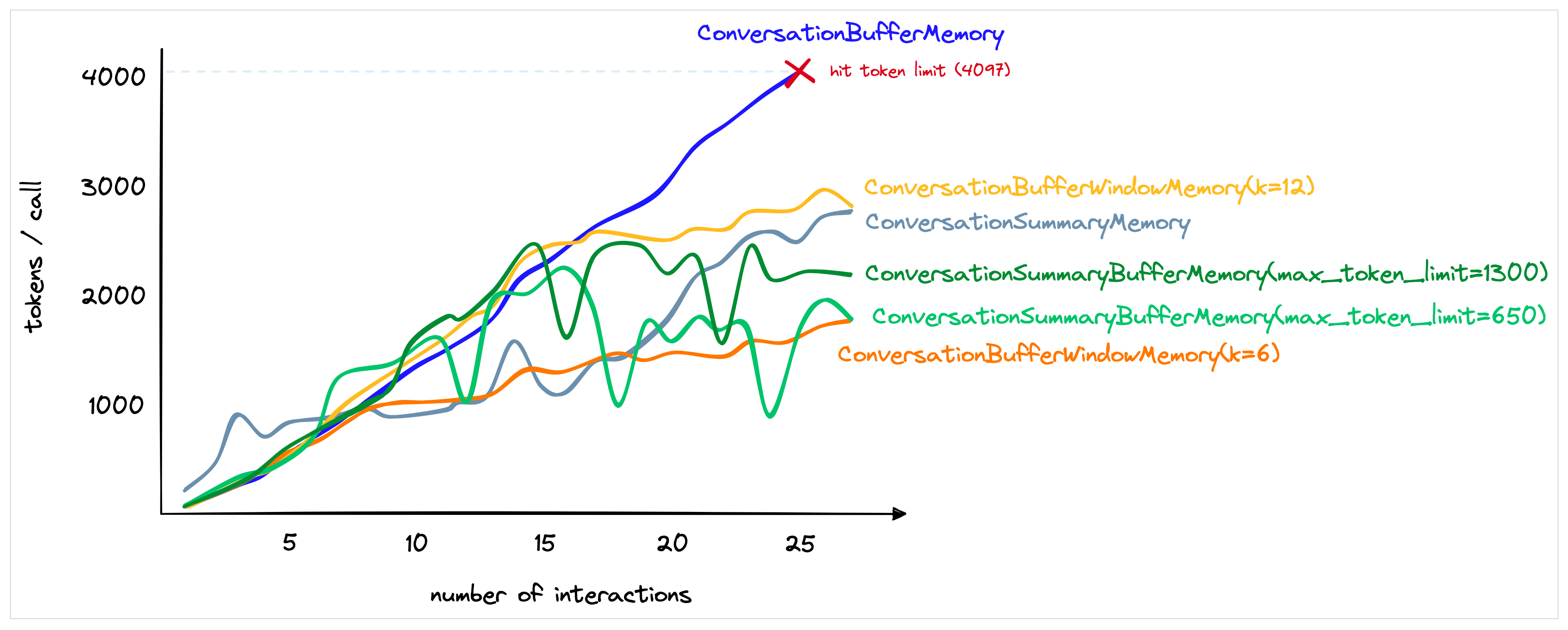 - 适合长对话:对于长对话,此方法的优势尤为明显。虽然最初使用的 Token 数量较多,但随着对话的进展,汇总方法的增长速度会减慢。与此同时,常规的缓冲内存模型会继续线性增长。
