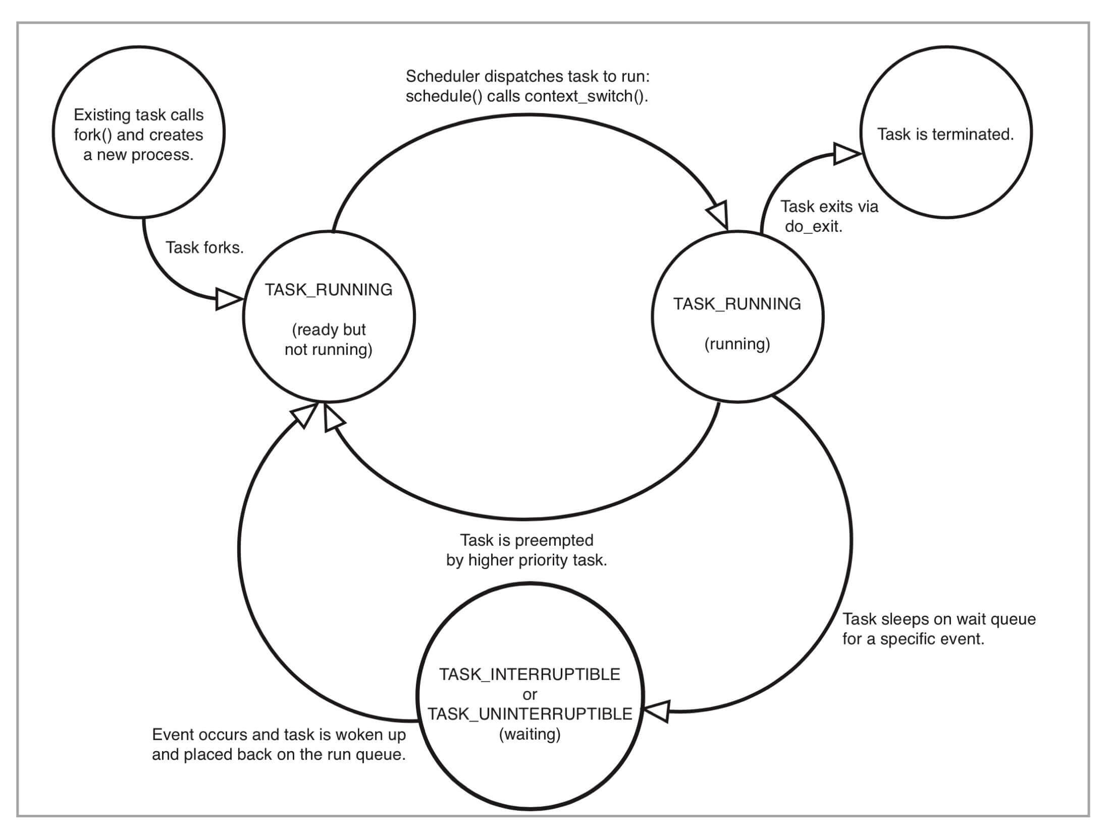 下面这个图是 《Linux Kernel Development》这本书里的Linux进程状态转化图。