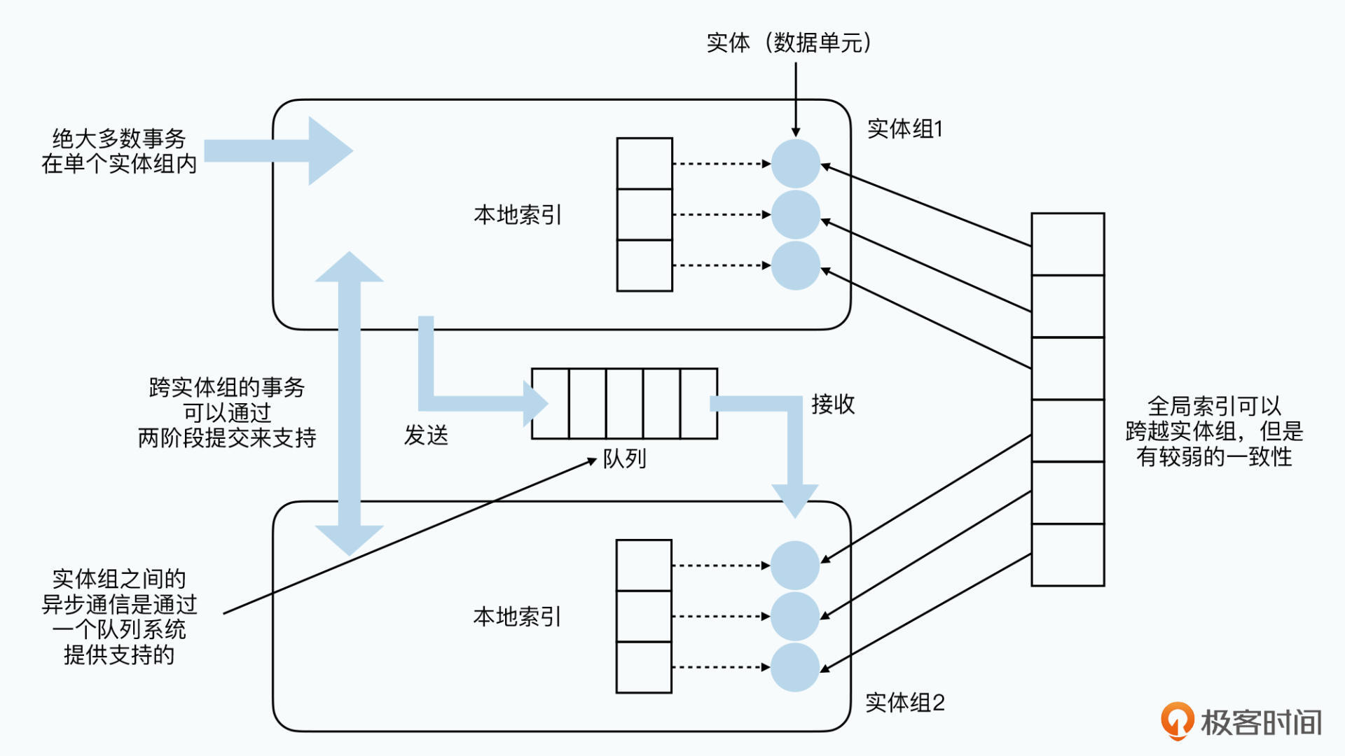 Megastore把数据按照分区划分成了很多“小数据库”,来解决Paxos算法的单节点性能瓶颈问题。而针对数据库事务,Megastore支持的是单个实体组内的一阶段事务。一旦要跨实体组,要么就要选择两阶段事务,要么就要采用并非事务性的异步消息机制。所以,Megastore虽然支持了SQL形式的接口,但是实际在应用中,仍然需要我们针对自己的数据模型进行精心的设计。