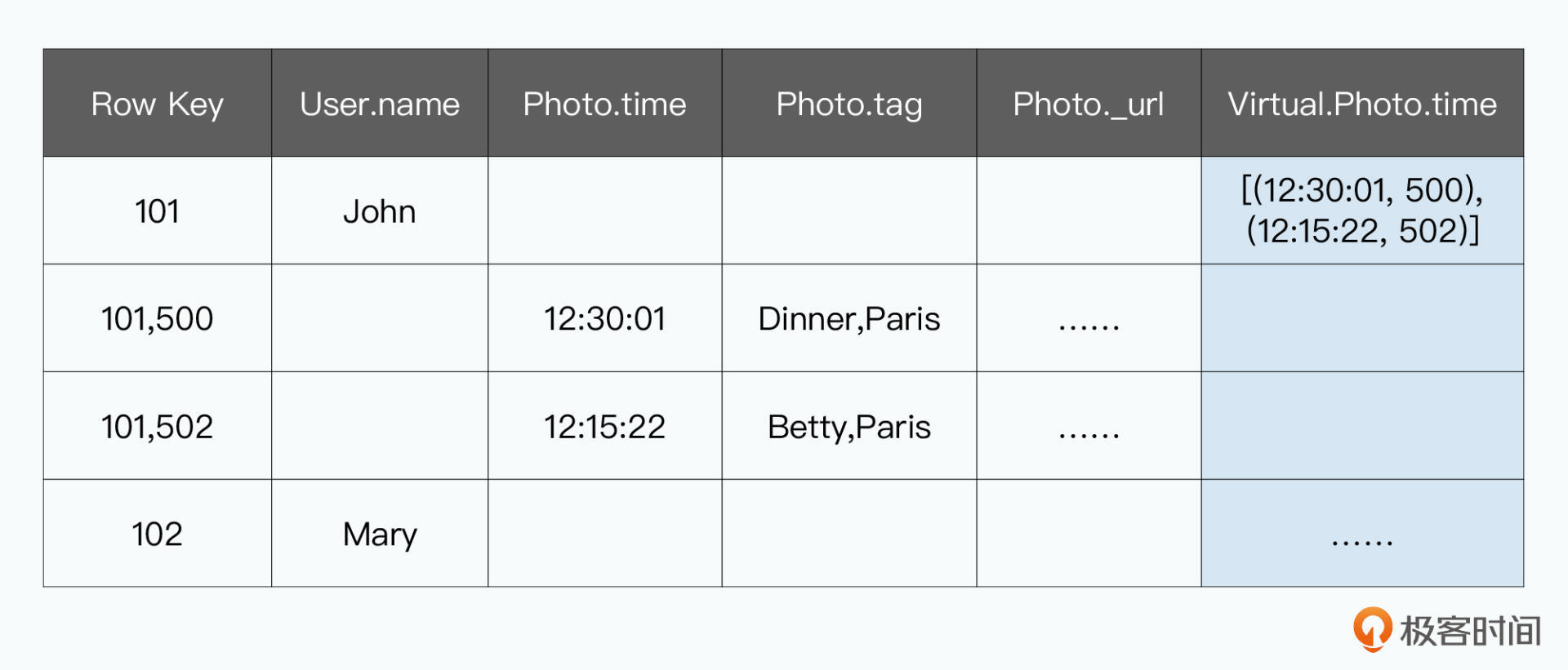 - 那么,索引这一行的行键,就是 ((user_id, time), (user_id, photo_id)) 这样的一个组合;