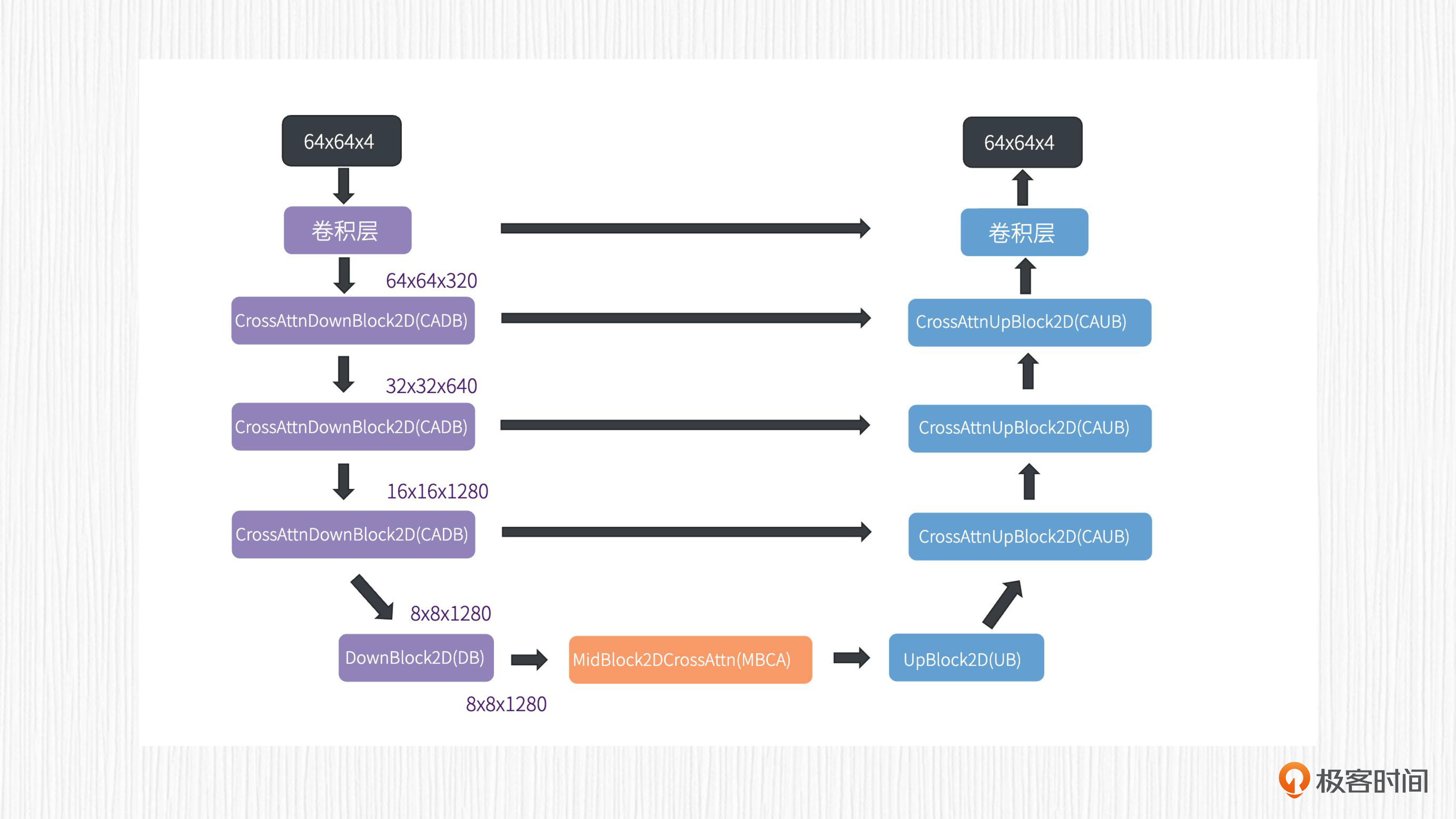 红框中SD模型部分展示的是我们熟悉的UNet结构,我们能看到,这里的UNet由12个编码器模块、1个中间模块和12个解码器模块构成。Prompt的文本表征和时间步t的编码都直接作用于这些模块。更多细节,你可以复习我们课程的[第15讲]。