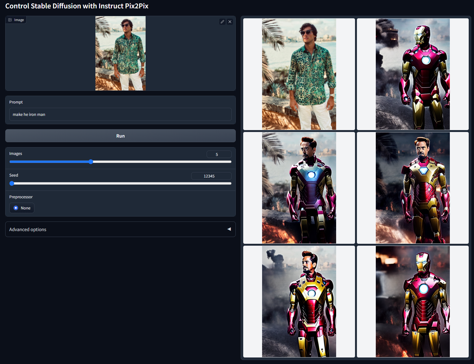 再比如后面这个例子,原始照片是一张人像照,我们可以利用prompt把绿衬衫的男人换成钢铁侠。可以看到,ControlNet保持了原始人像轮廓,生成了钢铁侠的效果。