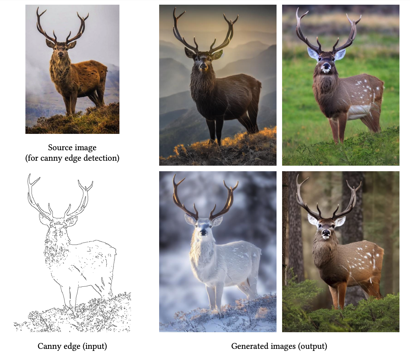 这里有两个要点值得我们关注。第一,我们的prompt中并不包括任何描述图像内容的信息,便可以得到四张不同鹿的照片。第二,生成的四张照片都满足我们输入的轮廓限制,并且效果各异。