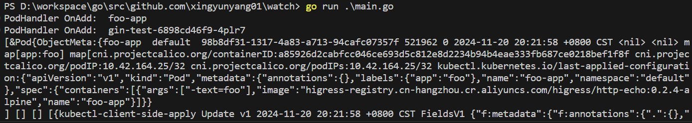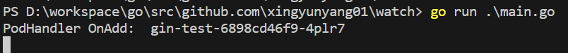我们运行程序后,可以看到,在 Add 事件回调中,打印出该 pod 的名字。