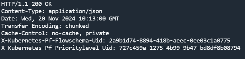 可以看到第一张图在返回头中,有一个 “Transfer-Encoding: chunked” 字段,这个字段在我们平时做 HTTP 分块下载功能时也会用到,它的效果是会将相关的资源卡住,于是就出现了第二张图的效果。这样当 default 命名空间下的 pod 发生变化时,Kubernetes 会将相关数据继续传给我们。