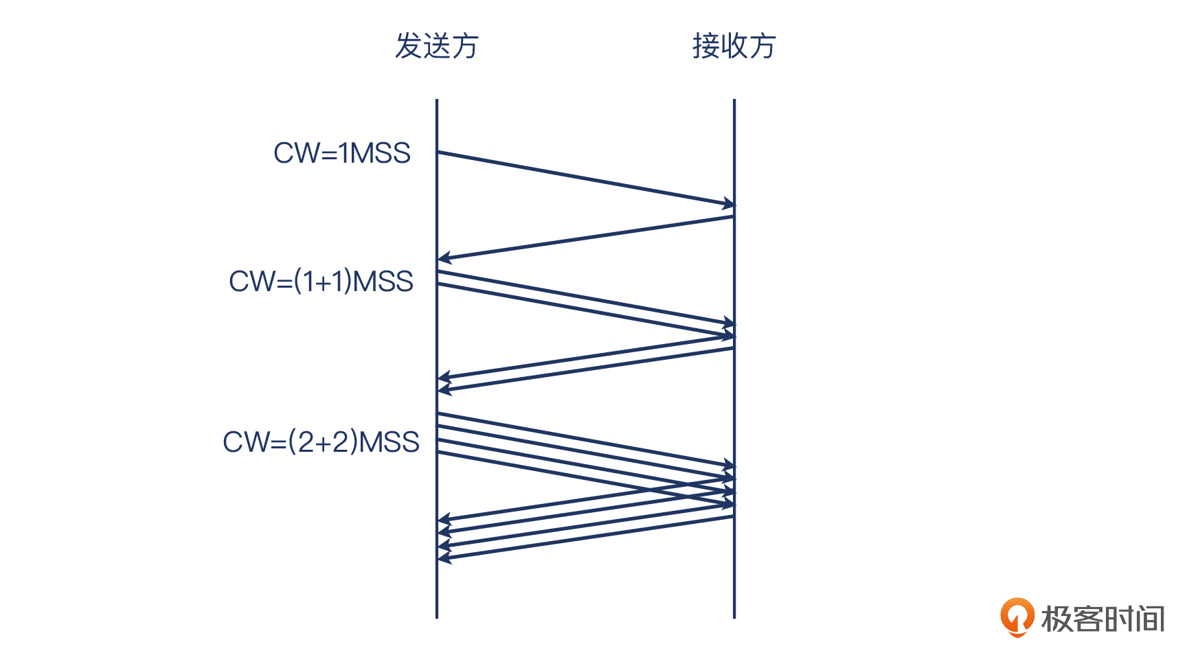 具体来说,在这个阶段,每次TCP收到一个确认了数据的ACK,拥塞窗口就增加一个MSS。比如下面这样: