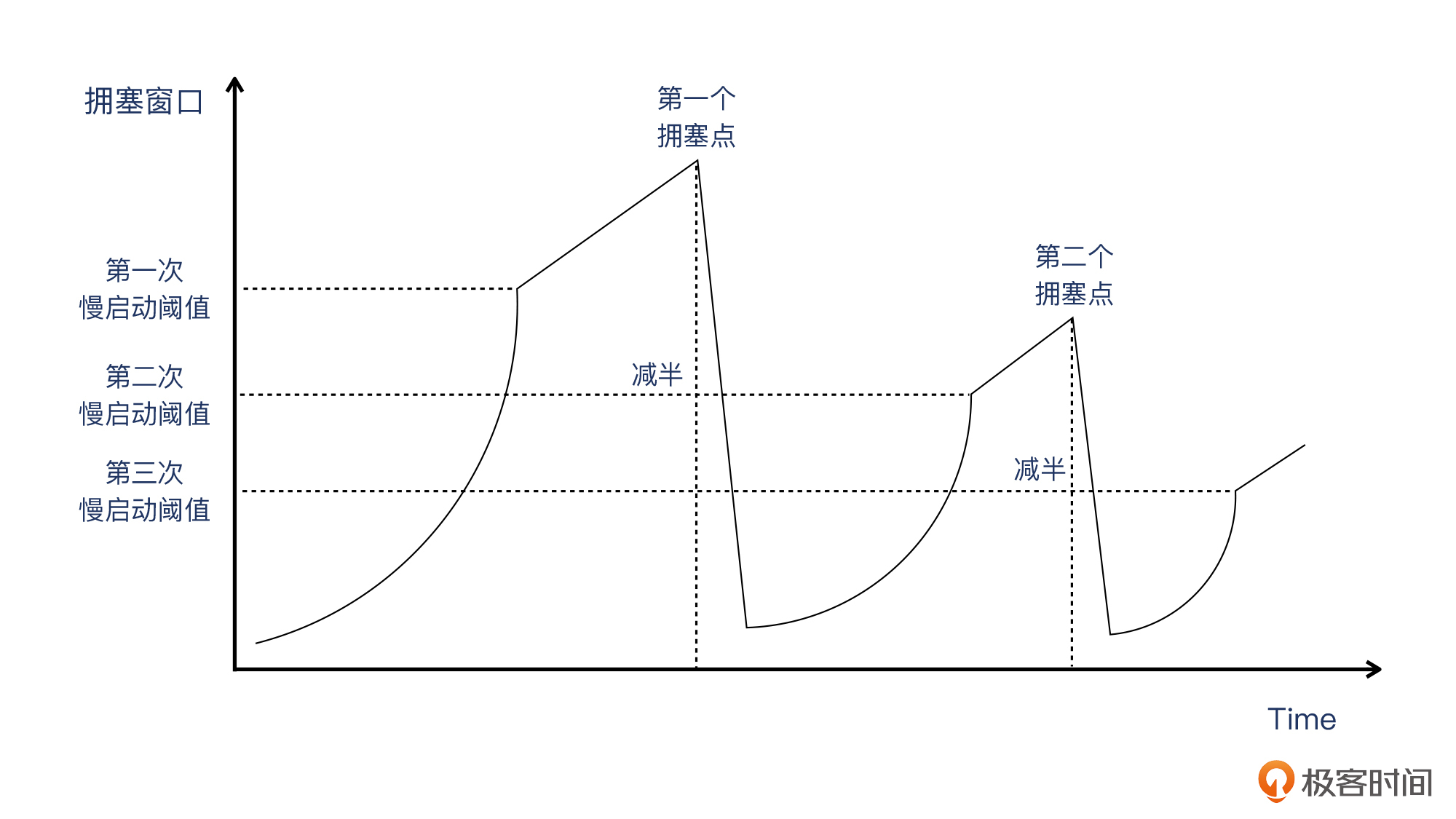 所以我们也发现,慢启动不是只在TCP连接启动时候发生,而是可能在传输过程中发生多次。前面的示意图里就显示,一旦拥塞避免阶段探测到了拥塞,TCP还是会回到慢启动过程,只是这次的慢启动阈值跟之前的不同。然后如果多次遇到拥塞,就会重复这个过程,直到传输结束。