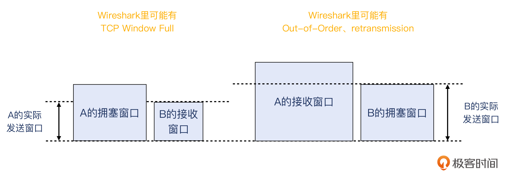 事实上,我们在第9讲也已经初步介绍了上面这些知识。我做一下搬运工,同时也做一下美工,对第9讲的图补充了Wireshark可能解读出来的信息,供你参考。下次你在Wireshark看到TCP Window Full、Out-of-Order、或者retransmission时,就可以跟这里的图对应起来,协助你排查传输速度方面的问题了。