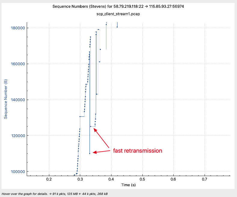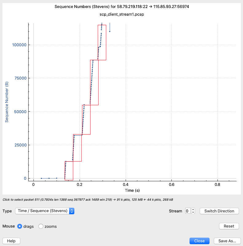 然后我们再看一下拥塞。在这个Graph中,也明显有几个点出现了异常。因为Y轴代表序列号,那么这些低处的点位,它们的序列号自然就是比前一个更低(也就是更小)的值,说明这些是老的报文再次发了出去,所以可以判断为是重传。