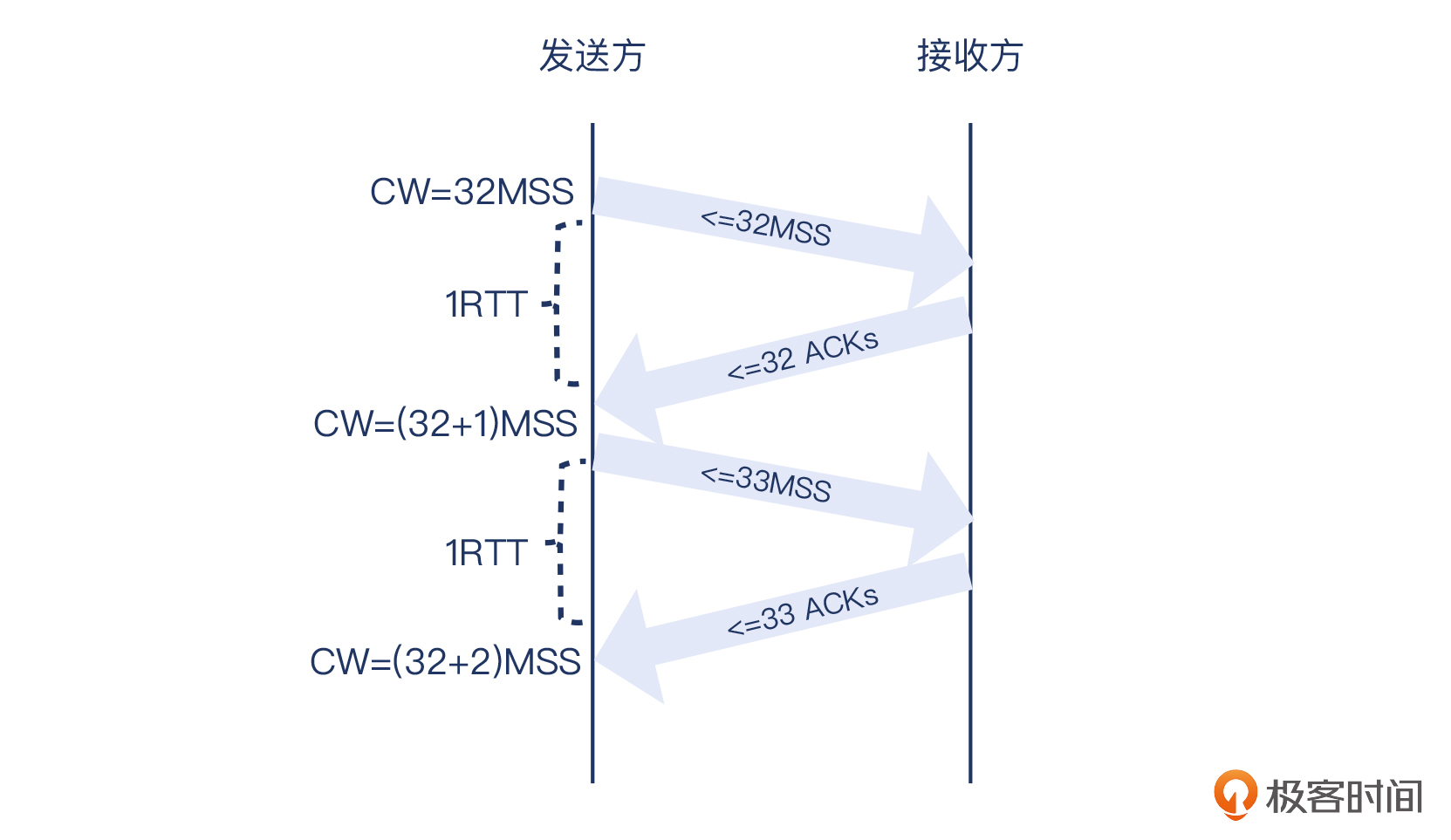 - 收到2个ACK,那么在这次RTT内,拥塞窗口就变成了4 MSS,这是“翻倍”的。