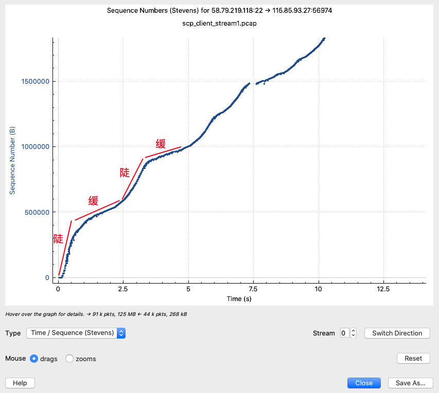 这里的斜率还是比较平稳的,说明虽然有很多乱序和重传,但整体速度还算稳定。当然,如果我们放大这条线,就能看到不同的景象了。比如放大到前10秒,明显曲线的波动幅度加大了不少: