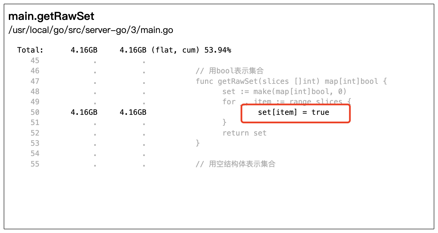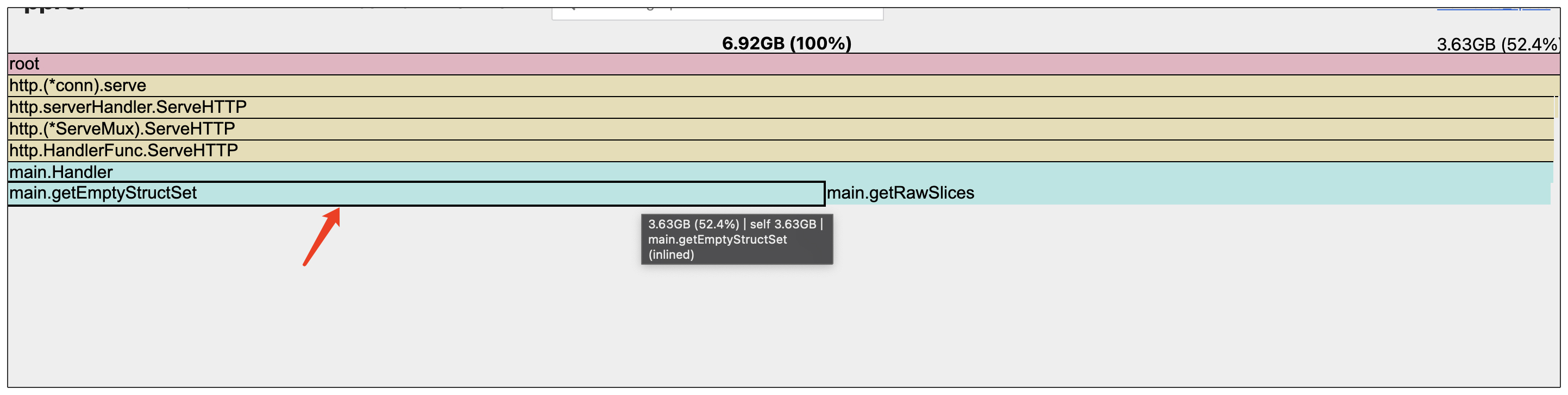 从火焰图中我们可以看到,用空结构体优化后,构造集合的getEmptyStructSet函数,依然是最消耗内存的函数。