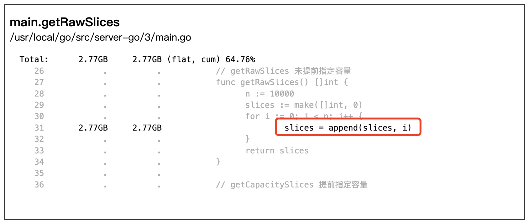 结合这行代码的上下文,可以知道这段代码逻辑是在循环地往切片里面做append操作。那么我们自然会想到,可以去看看切片的append操作是如何实现的,这里面有没有啥优化空间呢?