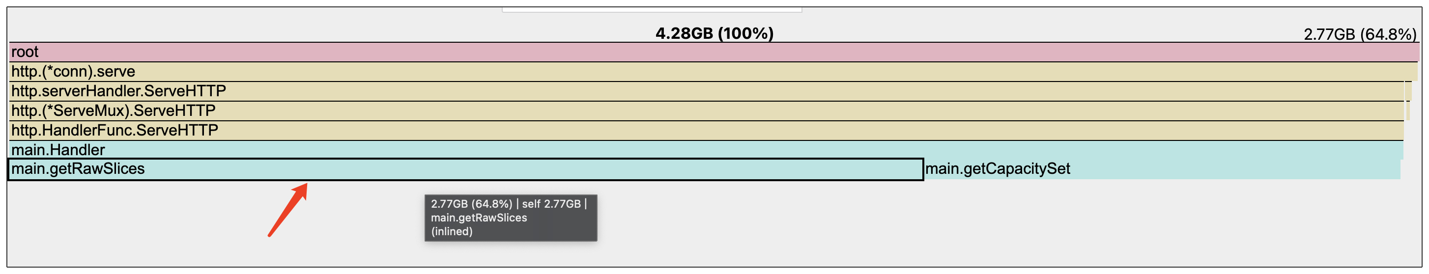 从内存火焰图中我们可以看出,除了已经优化后的集合构造函数getCapacitySet,现在最消耗内存的是切片生成函数getRawSlice。