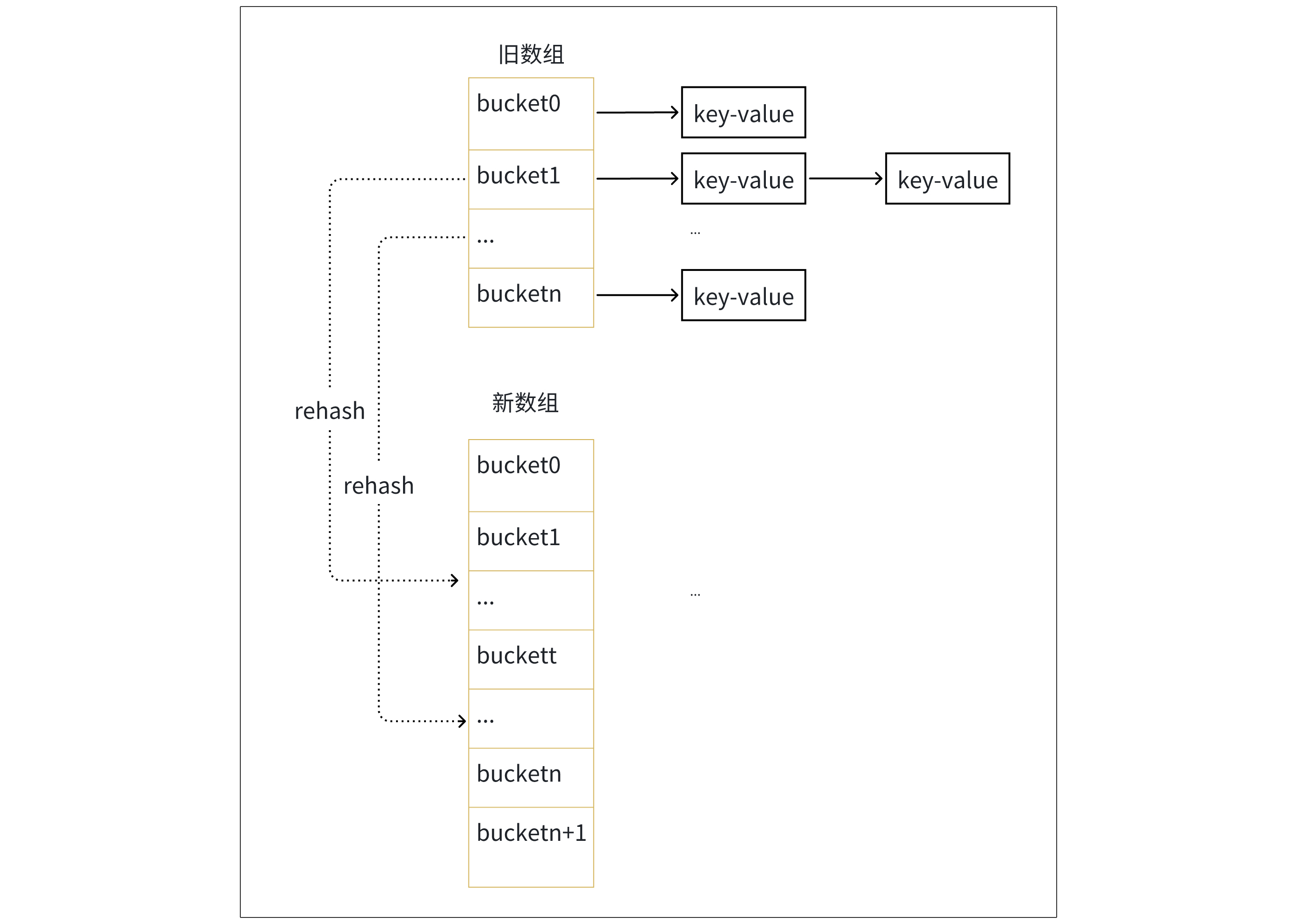 然后将旧数组空间数据迁移到新数组空间。Go采取了渐进式hash的思想,每次往map写入数据时,会触发从旧数组空间往新数组空间迁移两个桶链表数据,从而避免一次迁移全量数据导致map写请求延时抖动,直到旧数组空间的所有桶链表迁移完为止。