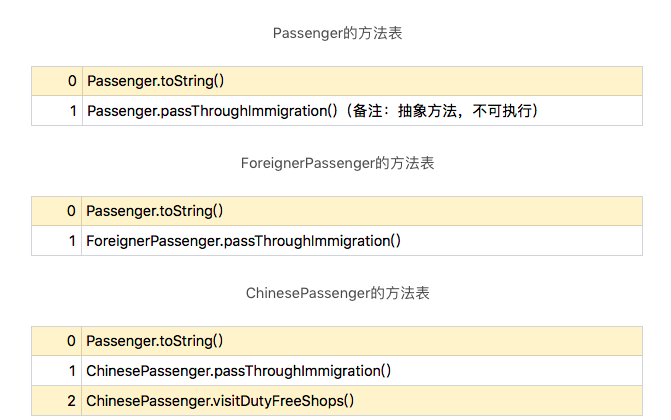 ChinesePassenger的方法表则包括三个方法,除了继承而来的Passenger类的toString方法,自己重写的passThroughImmigration方法之外,还包括独有的visitDutyFreeShops方法。