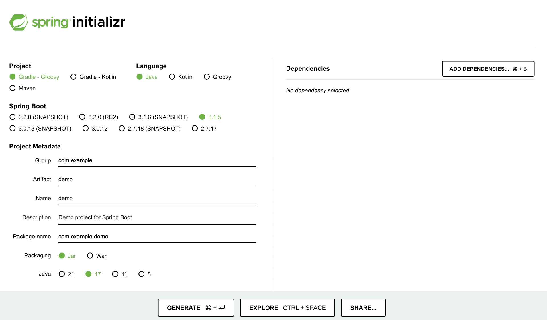 首先,我们需要安装 JDK 17,并配置环境变量。使用 Spring Initializr 创建一个新的 Spring Boot 项目,选择 Spring Boot 3 和 Spring 6 作为项目的依赖。